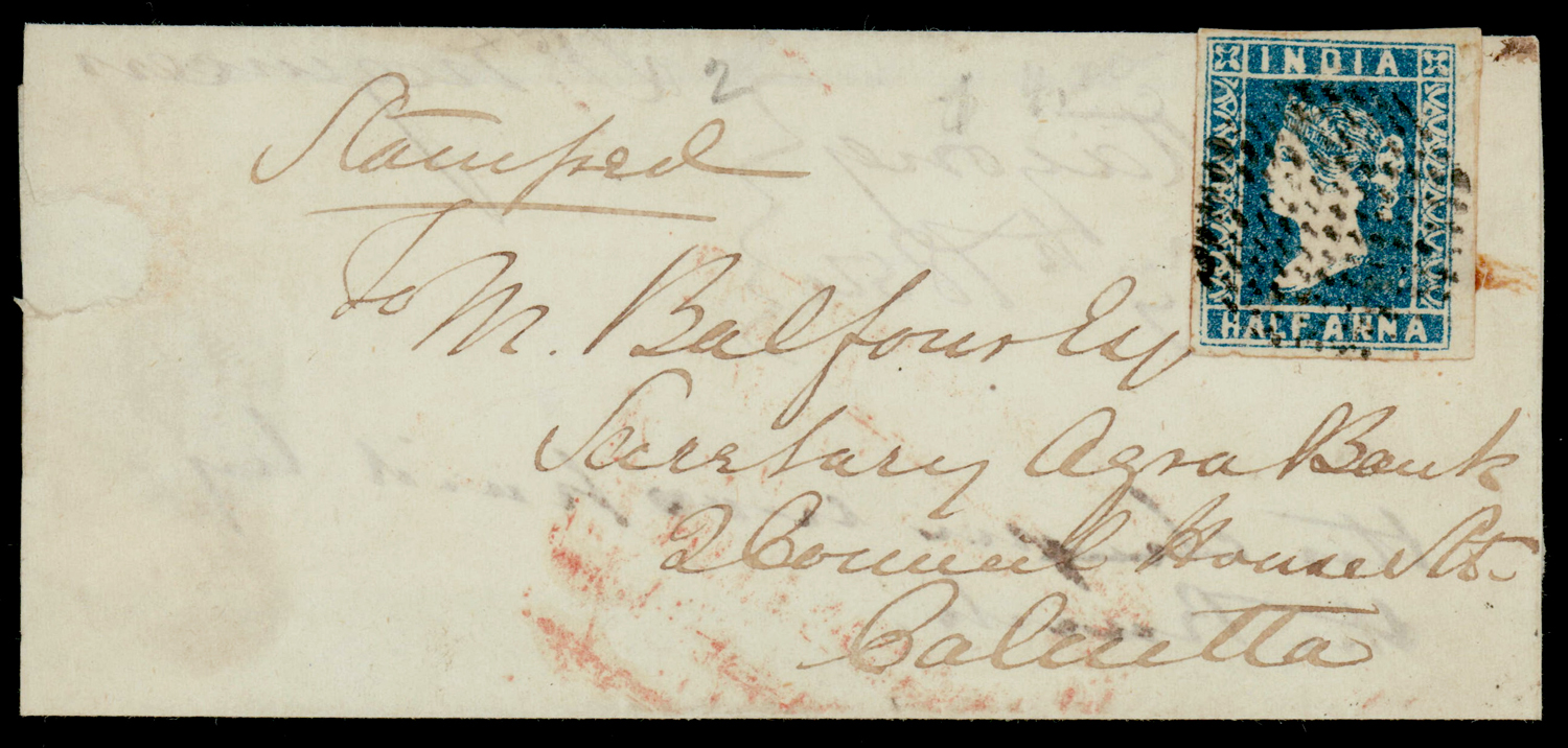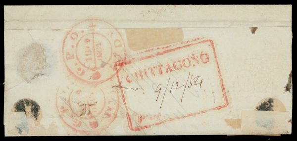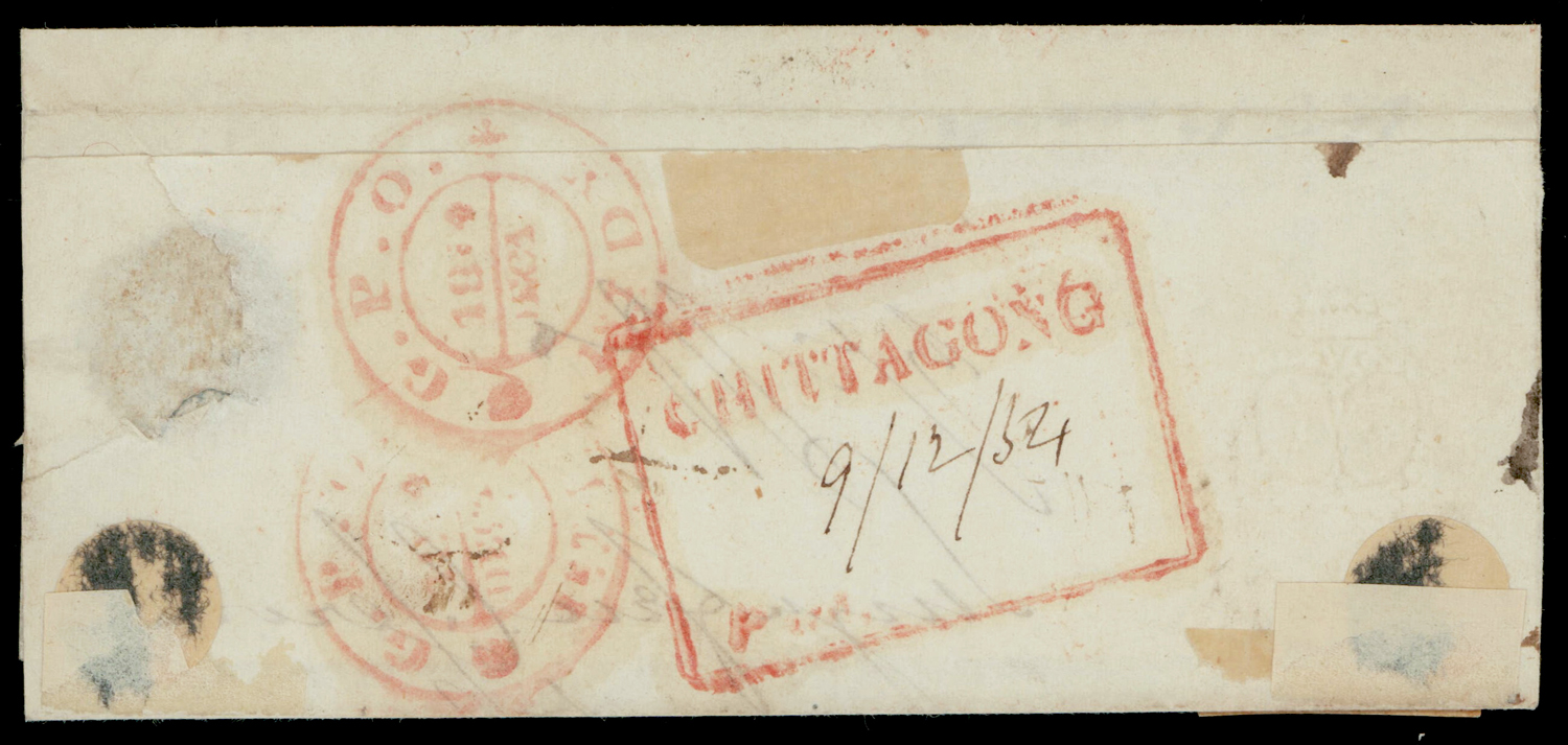 Early India Cancellation: Cooper type 1c circle of dots cancel on 1854 ½a deep blue on 1854 (Dec 9) folded letter from Chittagong (now in Bangladesh) to Calcutta. SG 4