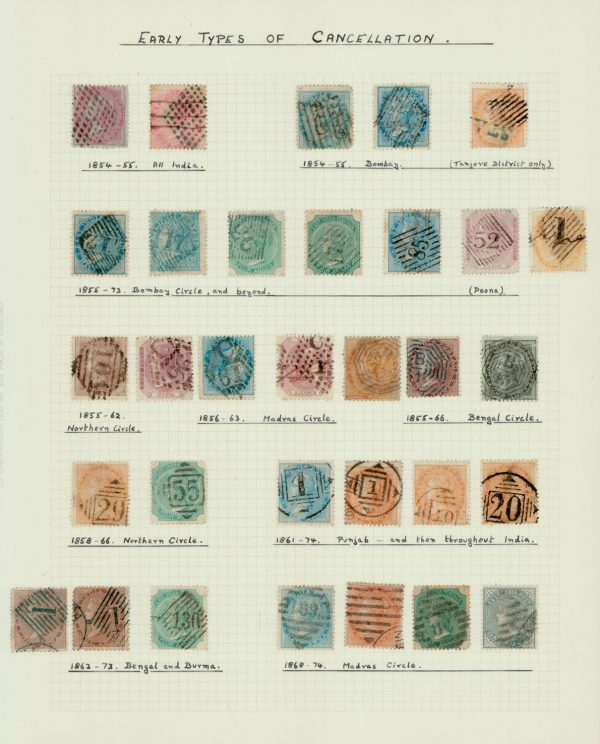 Early India Cancellations: Cooper type 1-12 on various East India stamps, written up on a page
