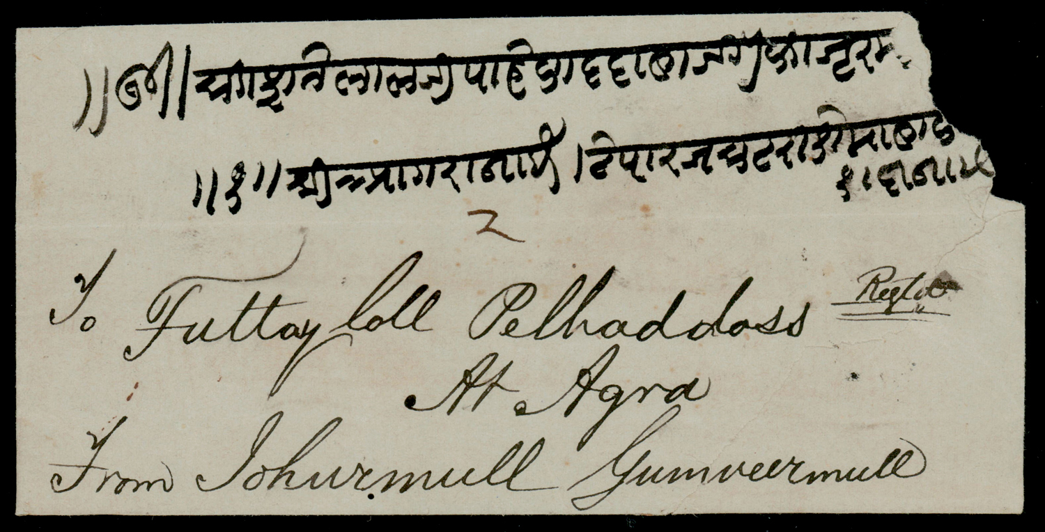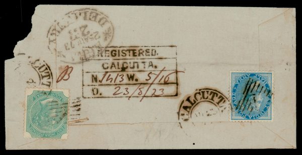 Early India Cancellations: Cooper type 10 “CALCUTTA/1” duplex on 1873 registered cover to Agra