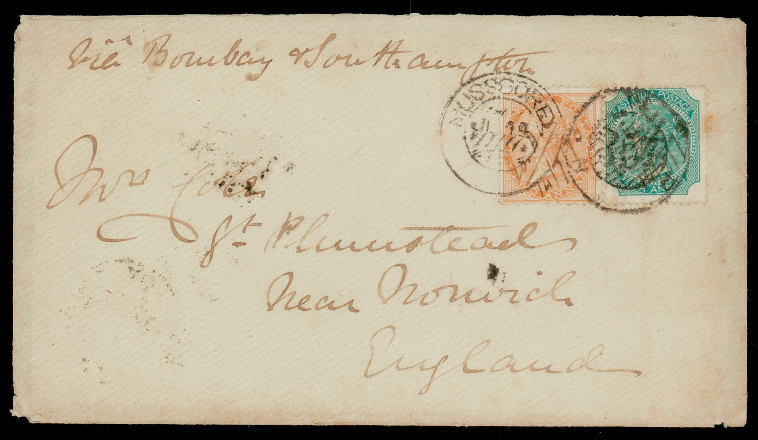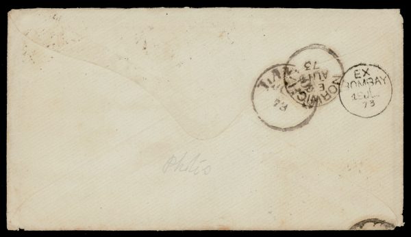 Early India Cancellations: Cooper type 13 “MUSSOOREE/NWP/367” duplex on 1873 6a cover to UK via Bombay and Southampton