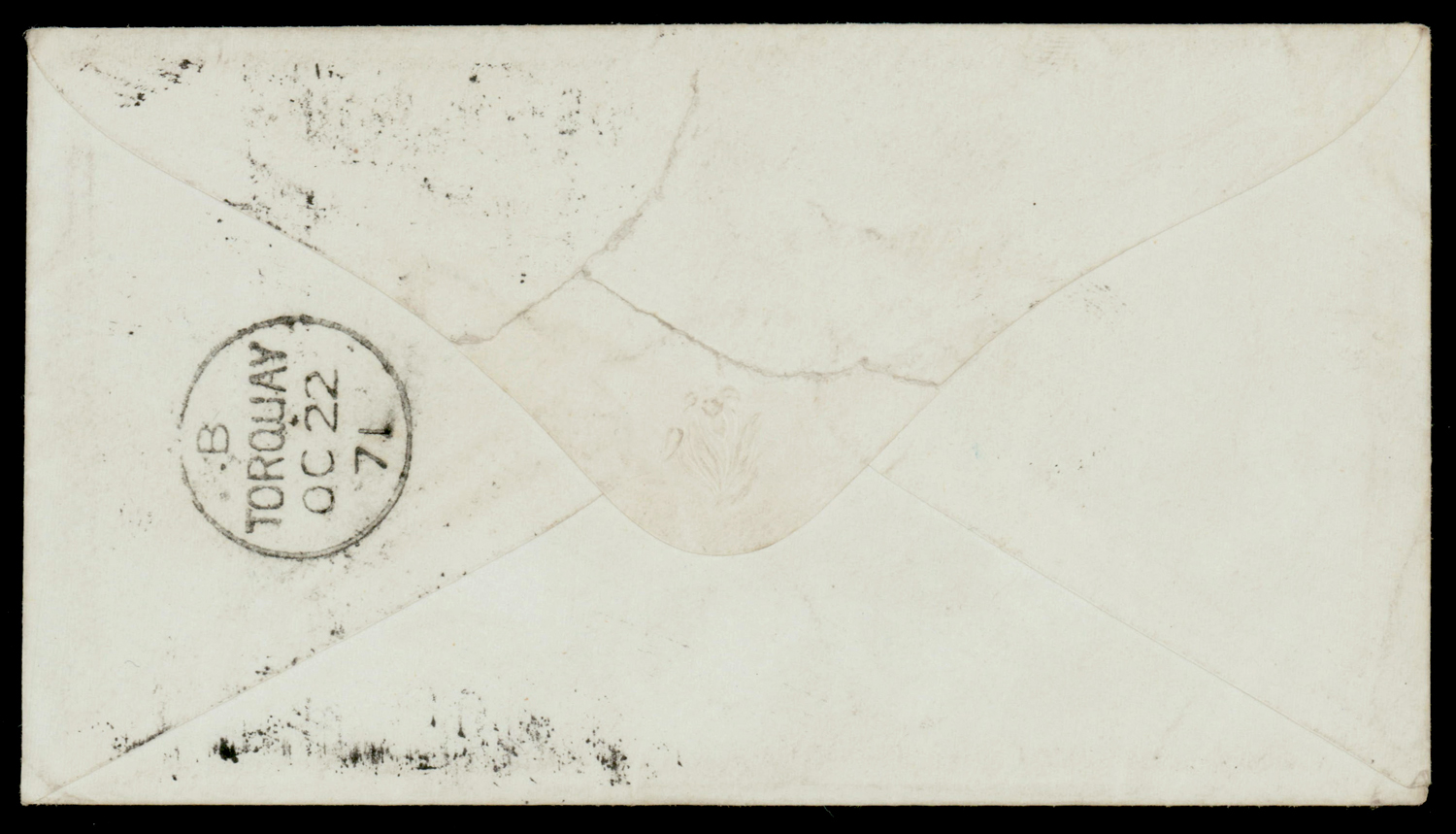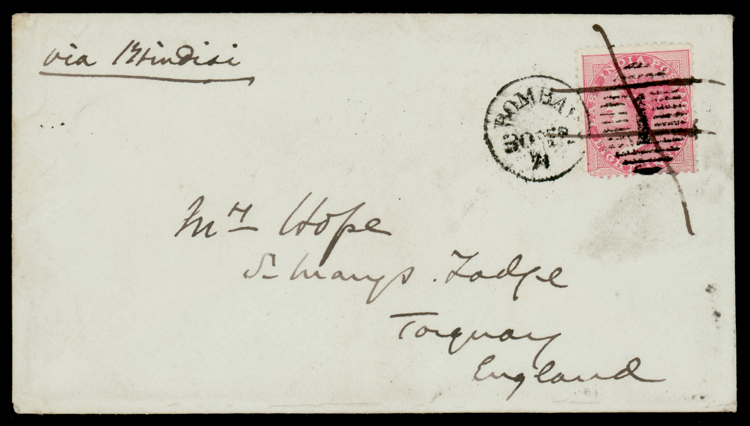 Early India Cancellations: Cooper type 15 “BOMBAY/1” duplex on 1871 8a cover to UK via Brindisi