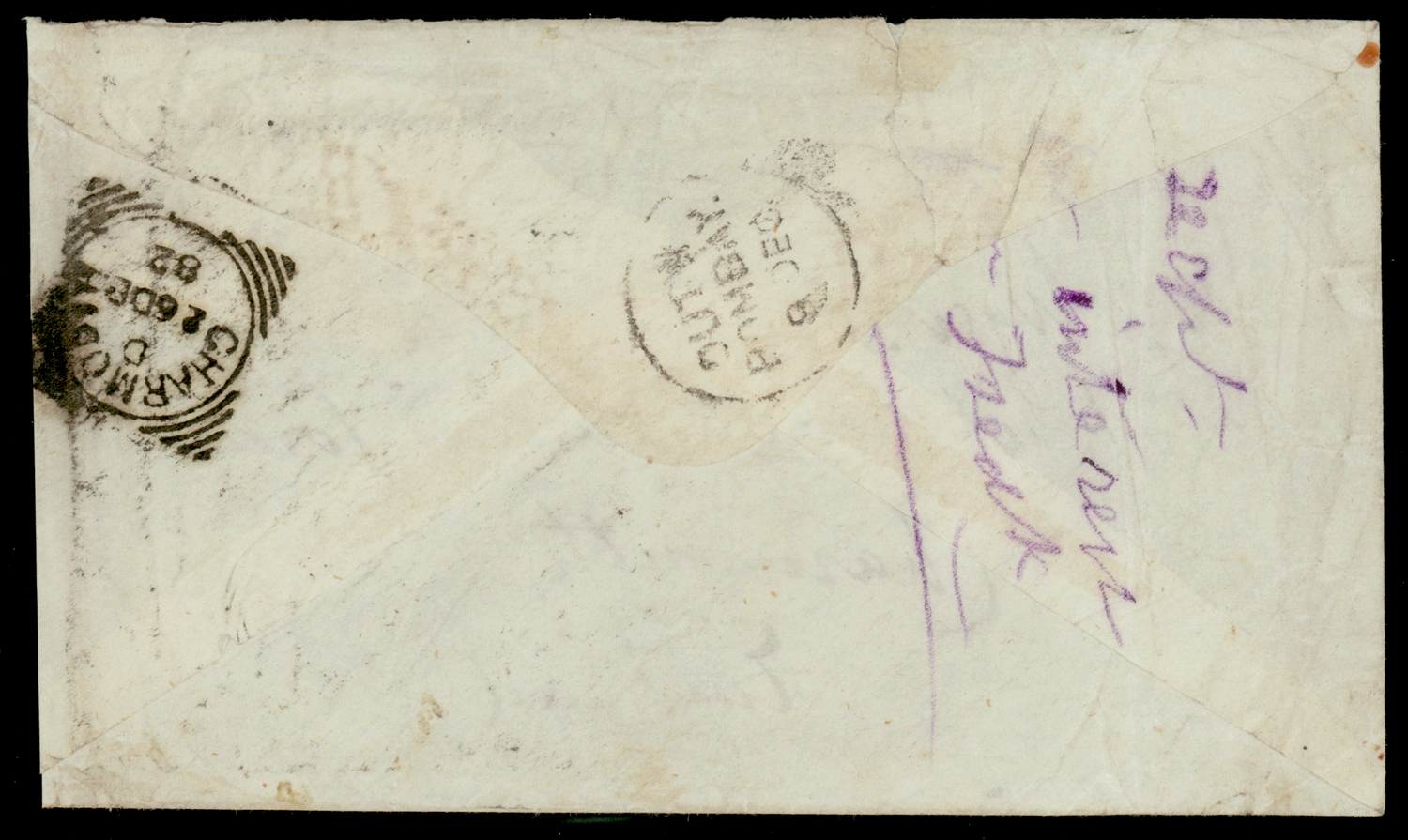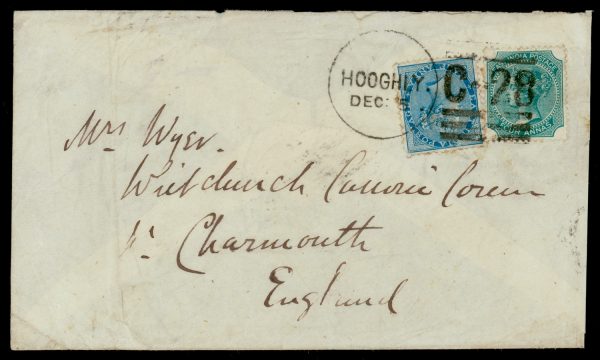 Early India Cancellations: Cooper type 32 “HOOGHLY/C-28” duplex on 1882 4½a cover to UK via Bombay and Brindisi