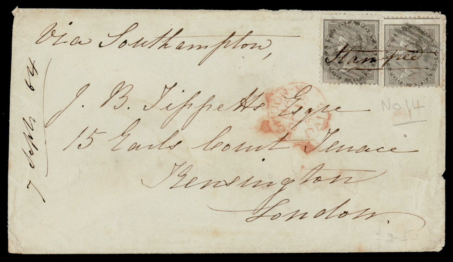 Early India Cancellations: Cooper type 4 on 1864 8a cover from Kirkee to London via Southampton