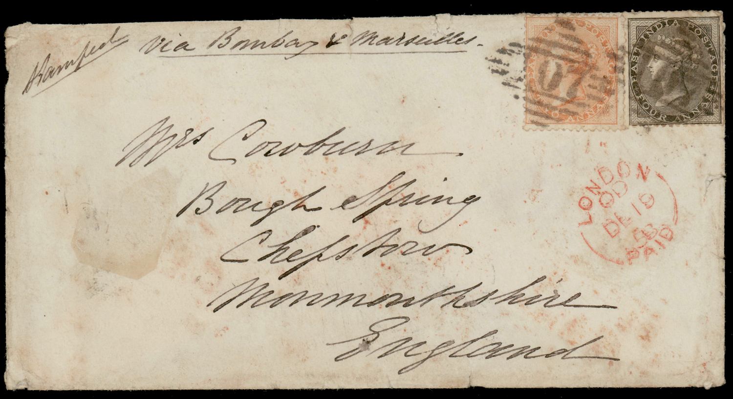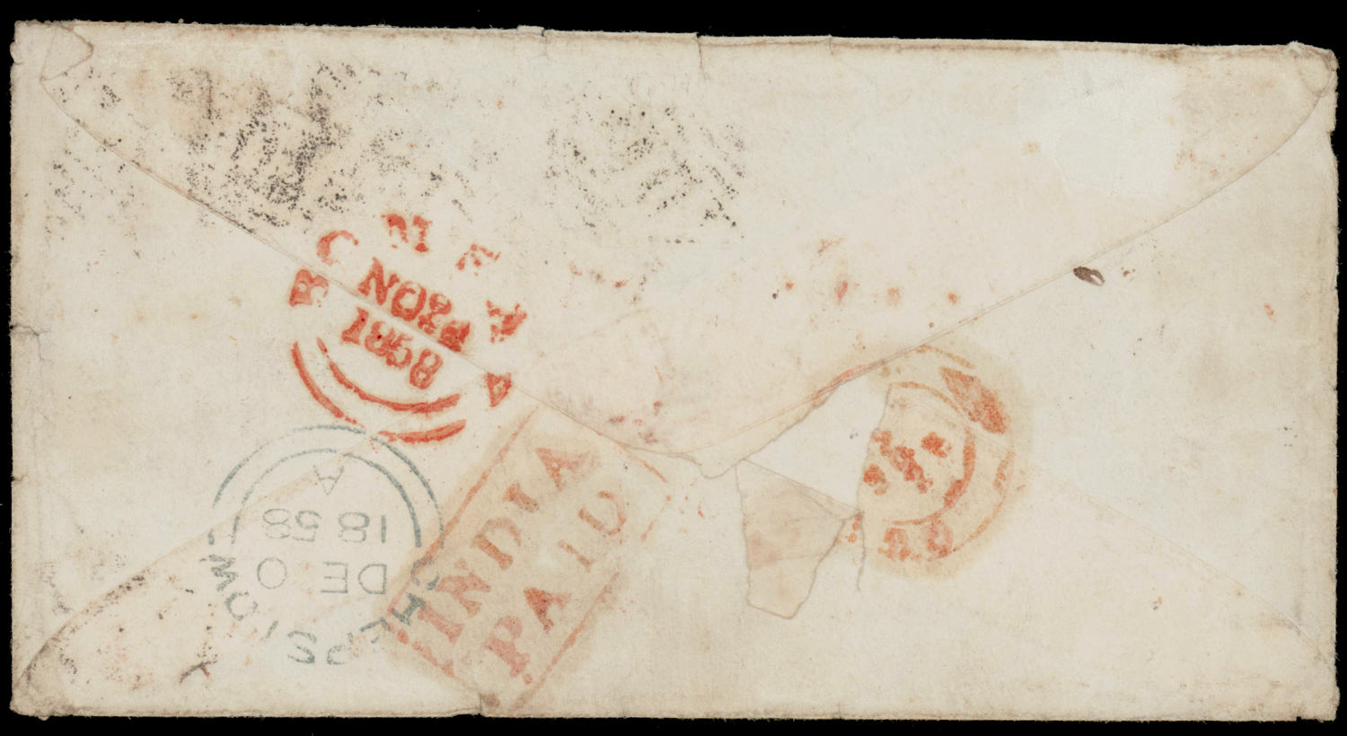 Early India Cancellations: Cooper type 5 on 1858 6a cover from Quilon to UK via Bombay and Marseilles