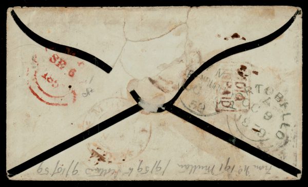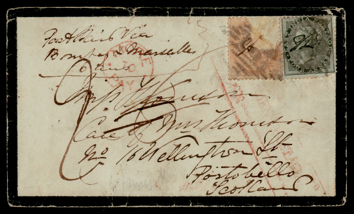 Early India Cancellations: Cooper type 5 on 1859 6a mourning cover from Mooltan to Scotland via Bombay and Marseilles, one stamp damaged