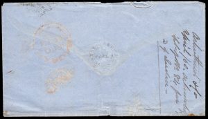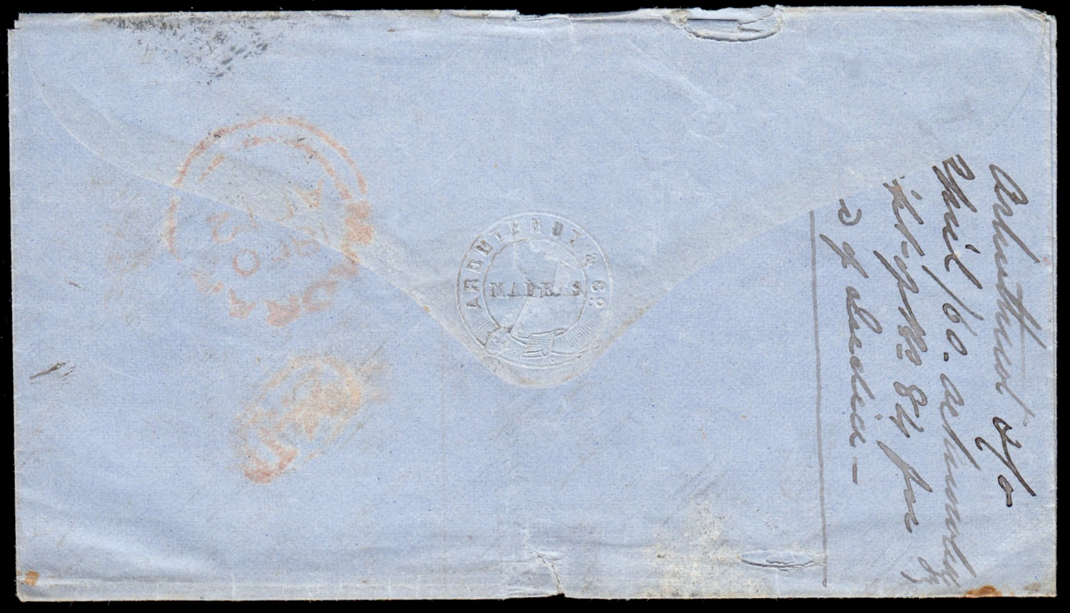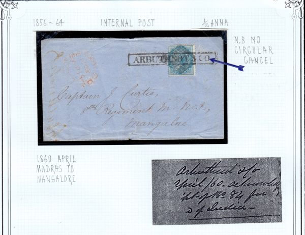 Early India Cancellations: Cooper type 6 on 1860 cover from Madras to Mangalore with boxed “ARBUTHNOT & CO.” forwarding agent’s mark