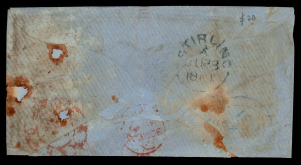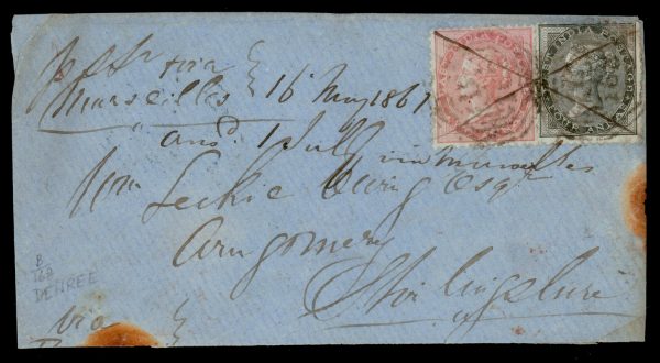 Early India Cancellations: Cooper type 7 “B/168” on 1867 6a cover from Doaree to Scotland via Marseilles