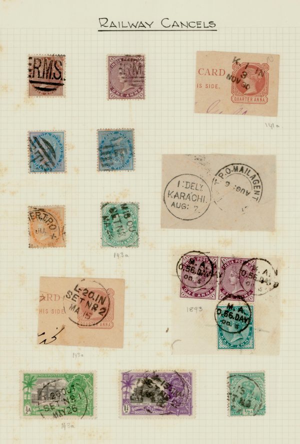 Early India Cancellations: Railway cancels on QV and GV stamps, written up on a page