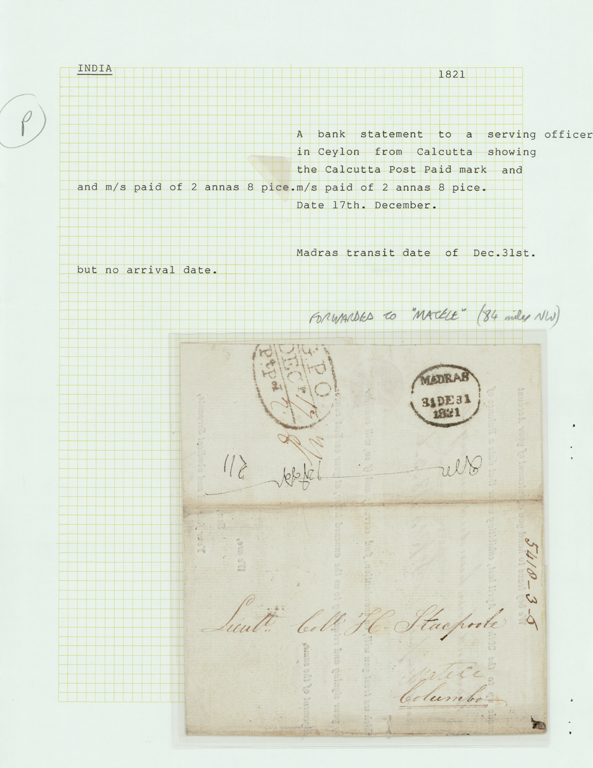 India 1821 Calcutta G.P.O. PtPd Giles 15 on folded letter to Colombo with MADRAS Giles MX3 transit