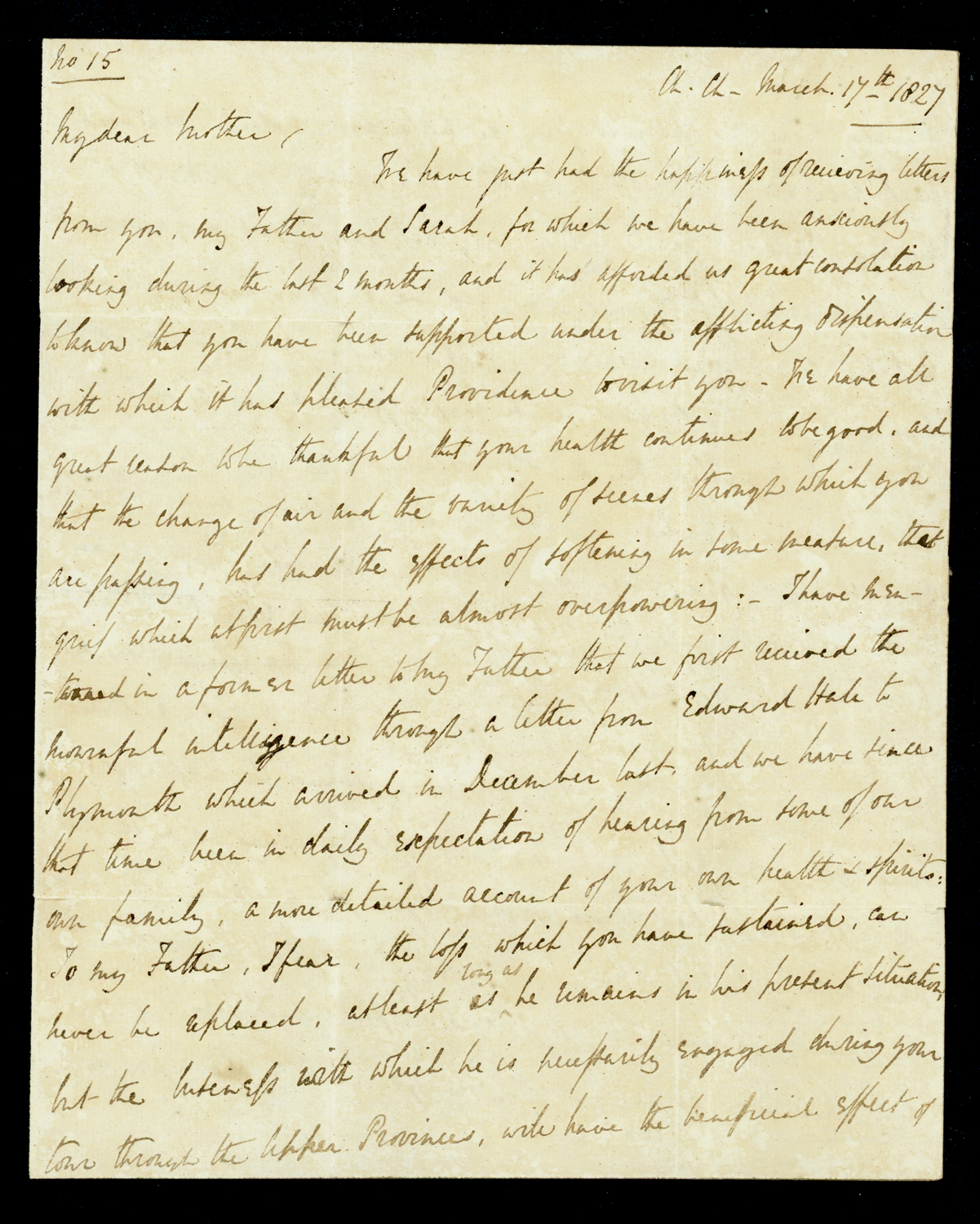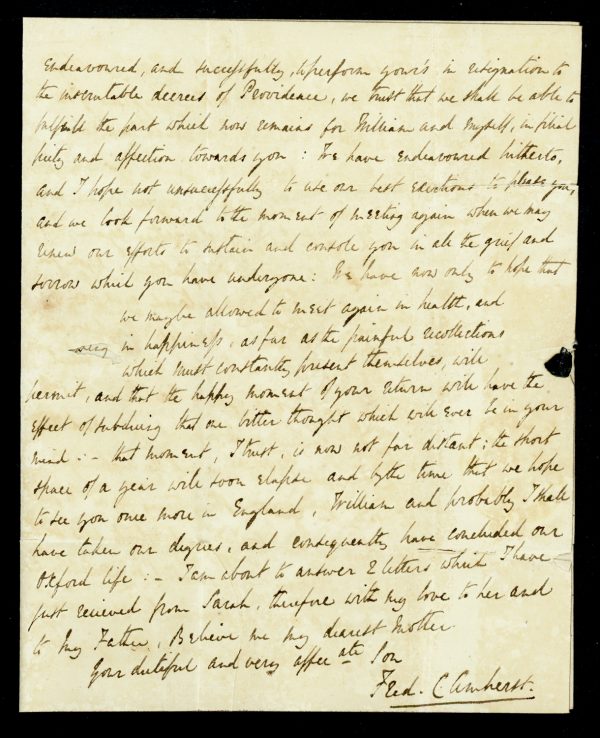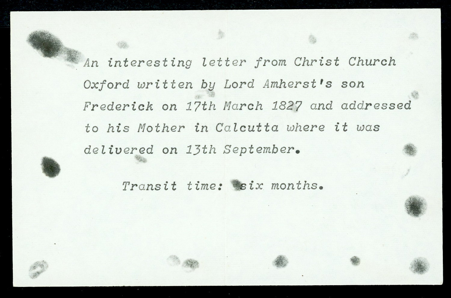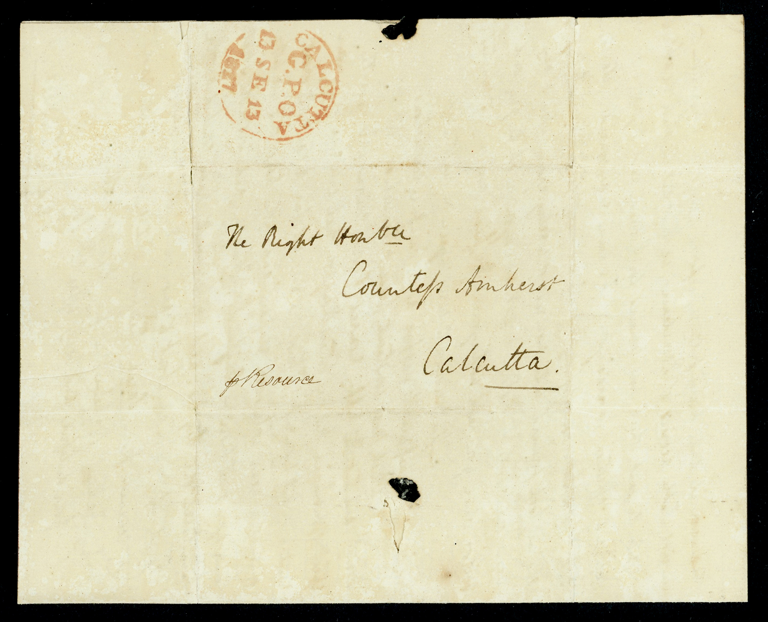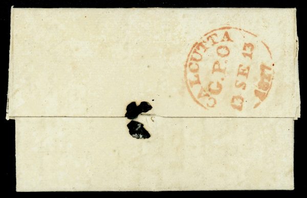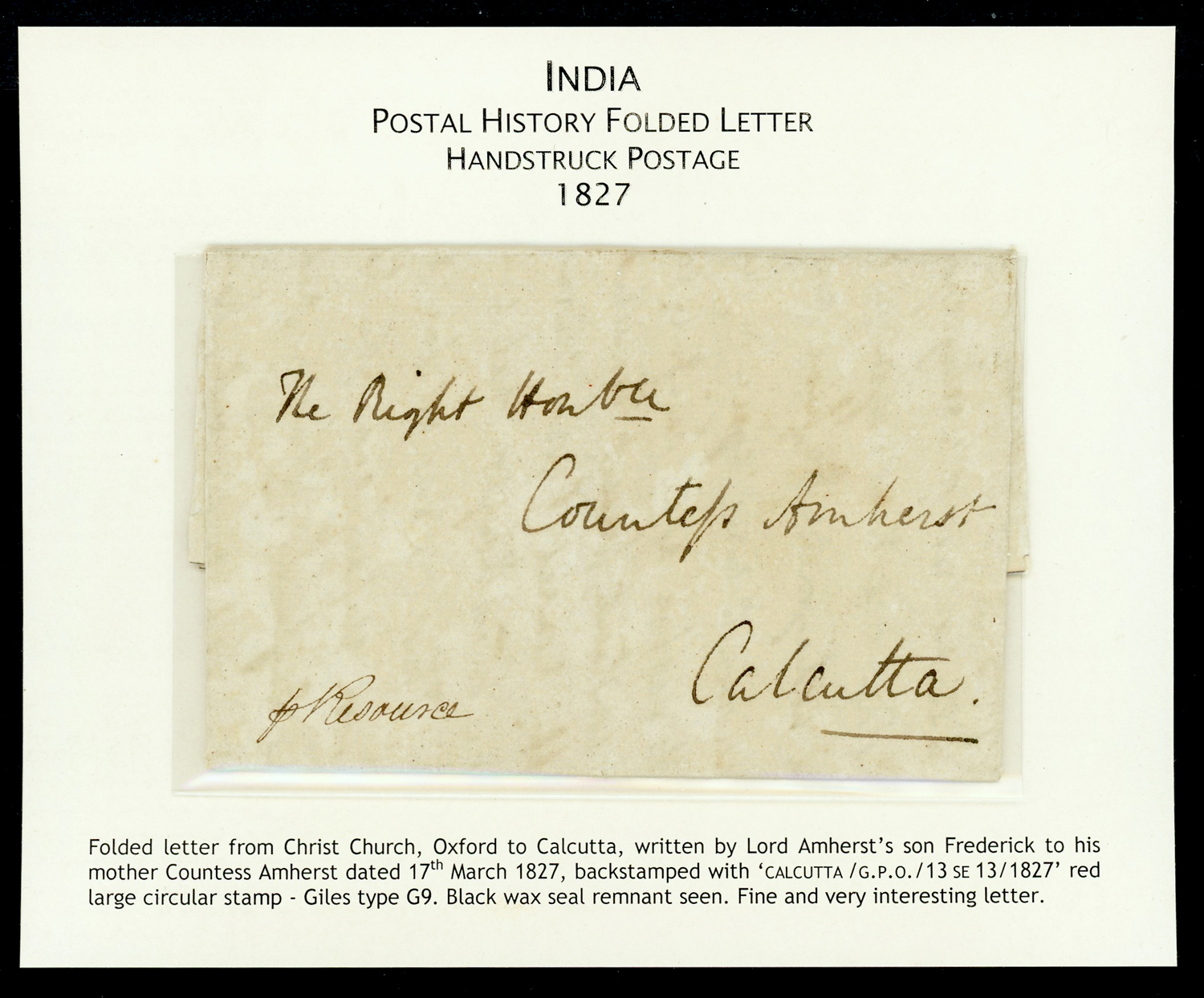 India 1827 (Mar 17) CALCUTTA G.P.O. Giles G9 on incoming folded letter from UK, written by Lord Amherst’s son Frederick to his mother, Countess Amherst.