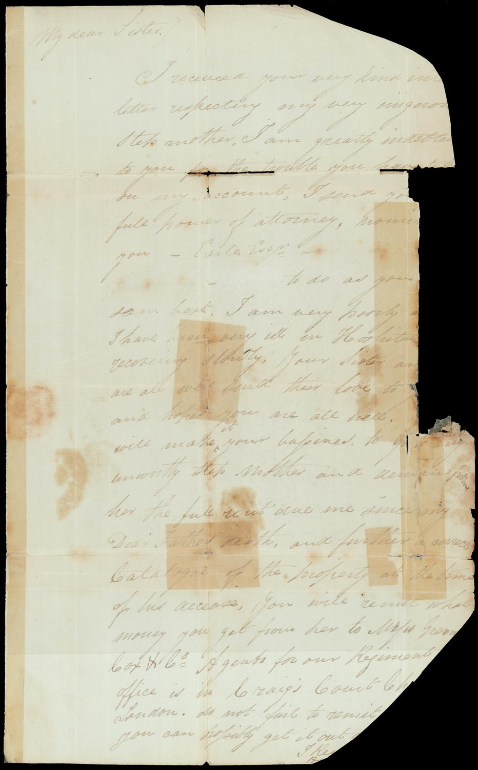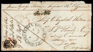 India 1832 (Jan 22) MADRAS SOLDIERS LETTER/FREE Giles SD10 on folded letter (and Power of Attorney) endorsed “From George Adams, Sergeant 54th Regiment” and properly countersigned by commanding officer, addressed to Dulwich Common, England, INDIA SOLDIER &c, PLYMOUTH/3 Concessionary Rate Letter (Robertson In. 1) and Madras (Jan. 22) despatch datestamp on back, framed “TP/Rate/2” and “In All” handstamps, partial London transit datestamp, cover and letter with internal splitting and rather heavy edgewear, some slight toning, still very fine strike of this rare Plymouth concessionary rate marking, very few examples are thought to exist.