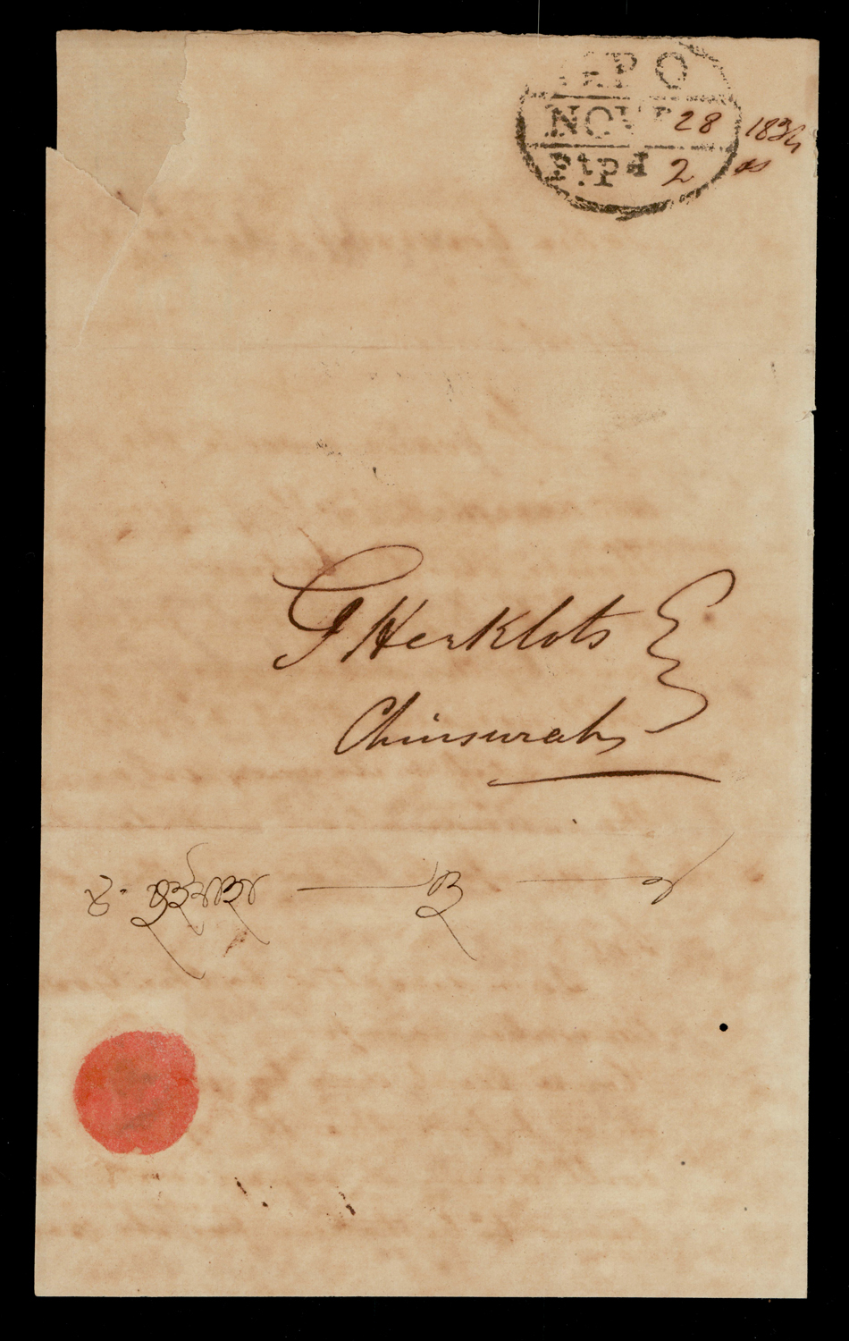 India 1834 (Nov 28) Calcutta G.P.O. Giles 16 on folded letter to Chinsurah, ex Dutch colony in Bengal