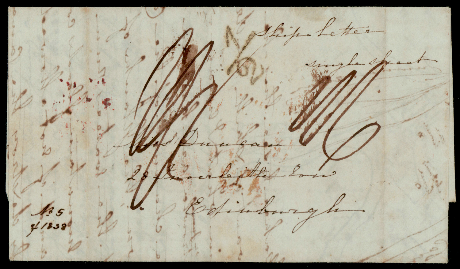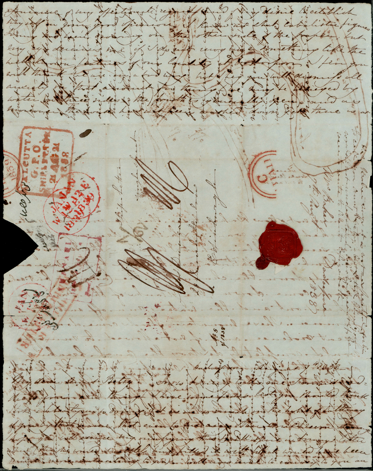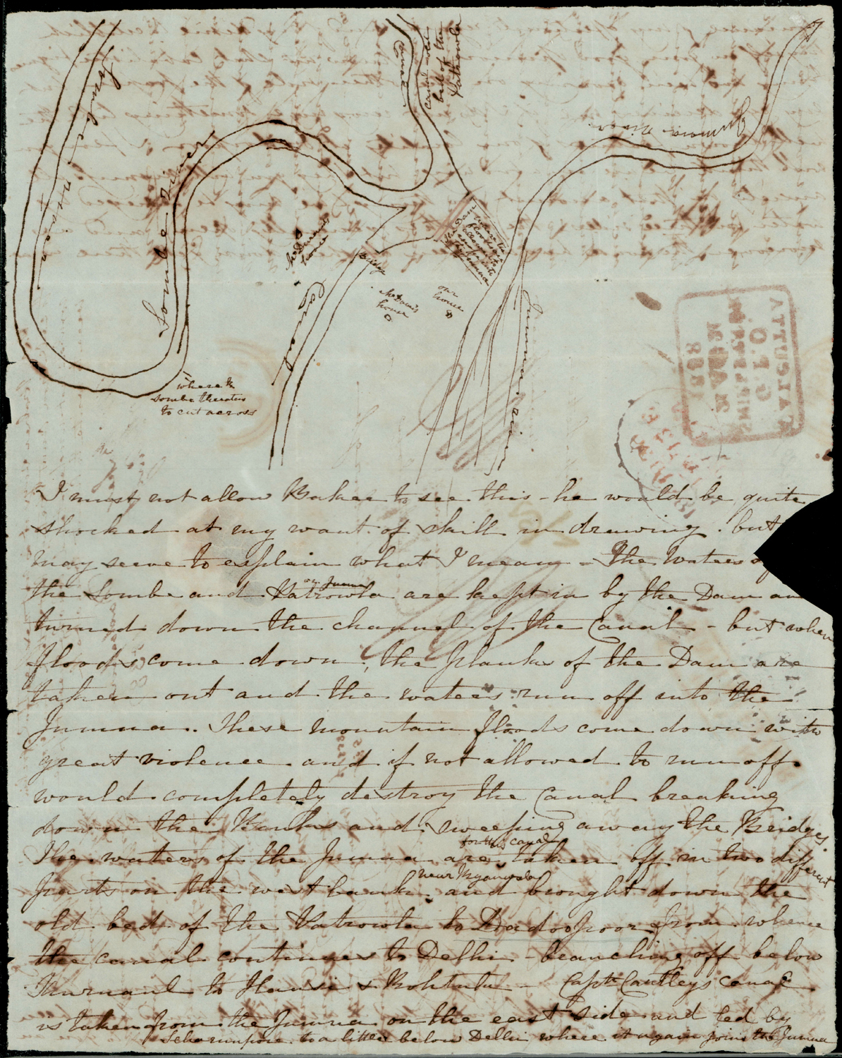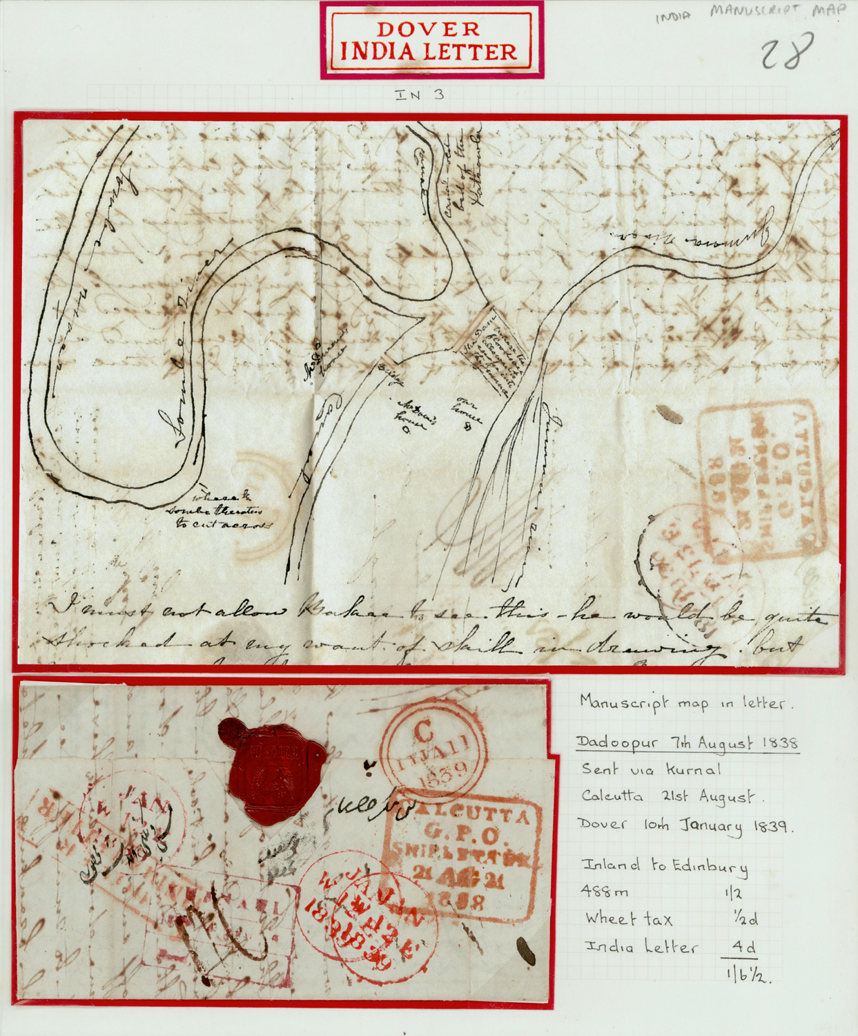 India 1838 (Aug 21) KURNAUL Paid Giles 3 on folded letter from Dadoopore to UK with CALCUTTA G.P.O. SHIPLETTER Giles SD10, with handdrawn map of the surroundings showing the Jumna river and Dams/Canals, from the Duncan correspondence