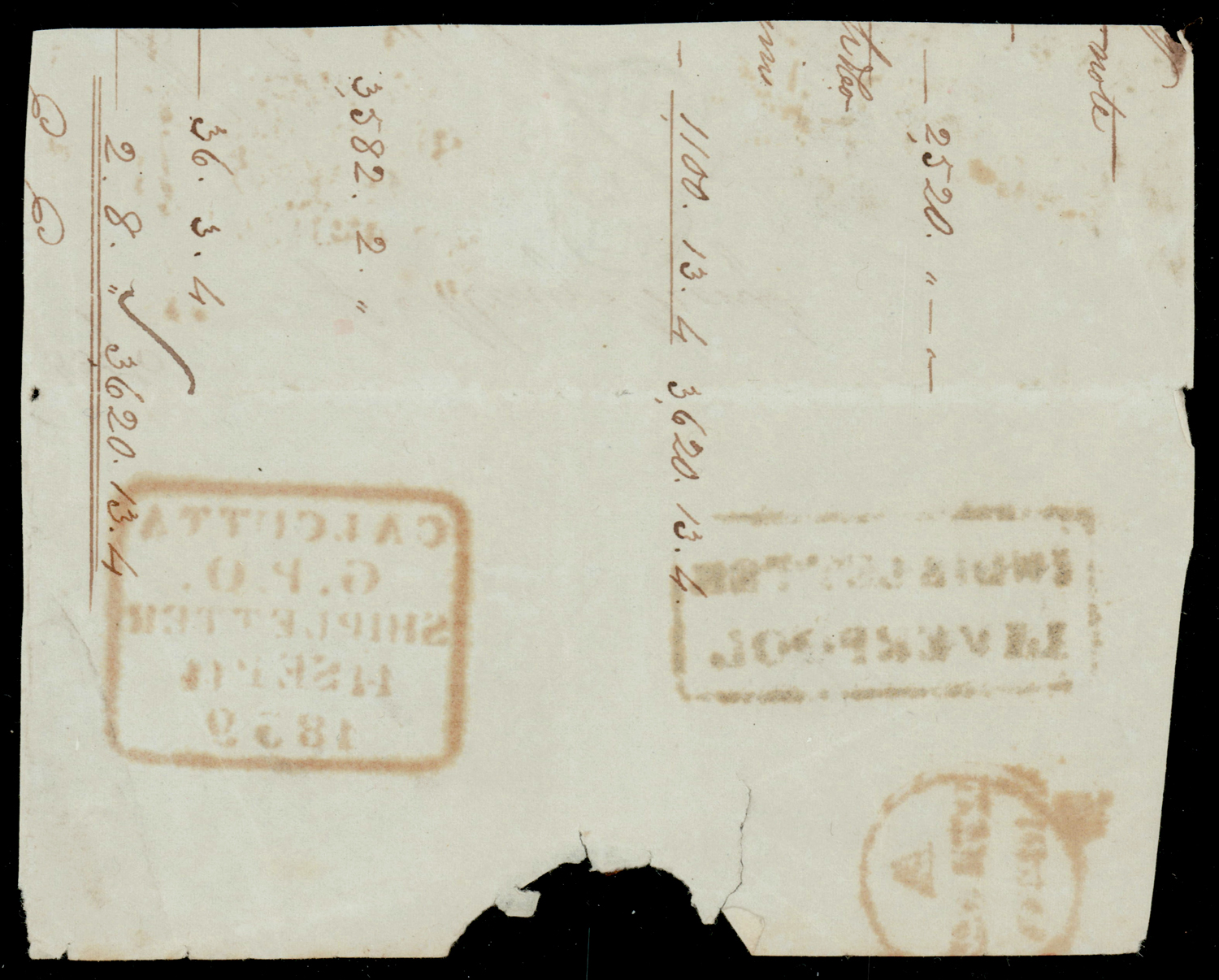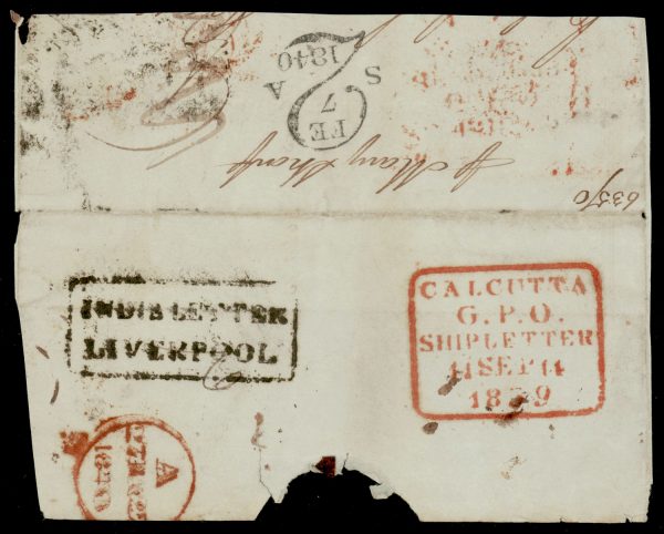 India 1839 CALCUTTA G.P.O. SHIPLETTER in red, Giles SD11 on part fl to UK