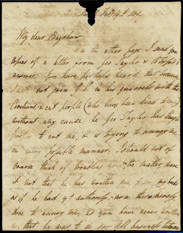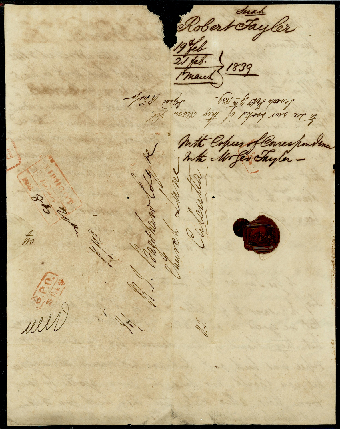 India 1839 (Feb 20) TIRHOOT Paid Giles 2 on folded letter to Calcutta, with boxed PM and Calcutta G.P.O.