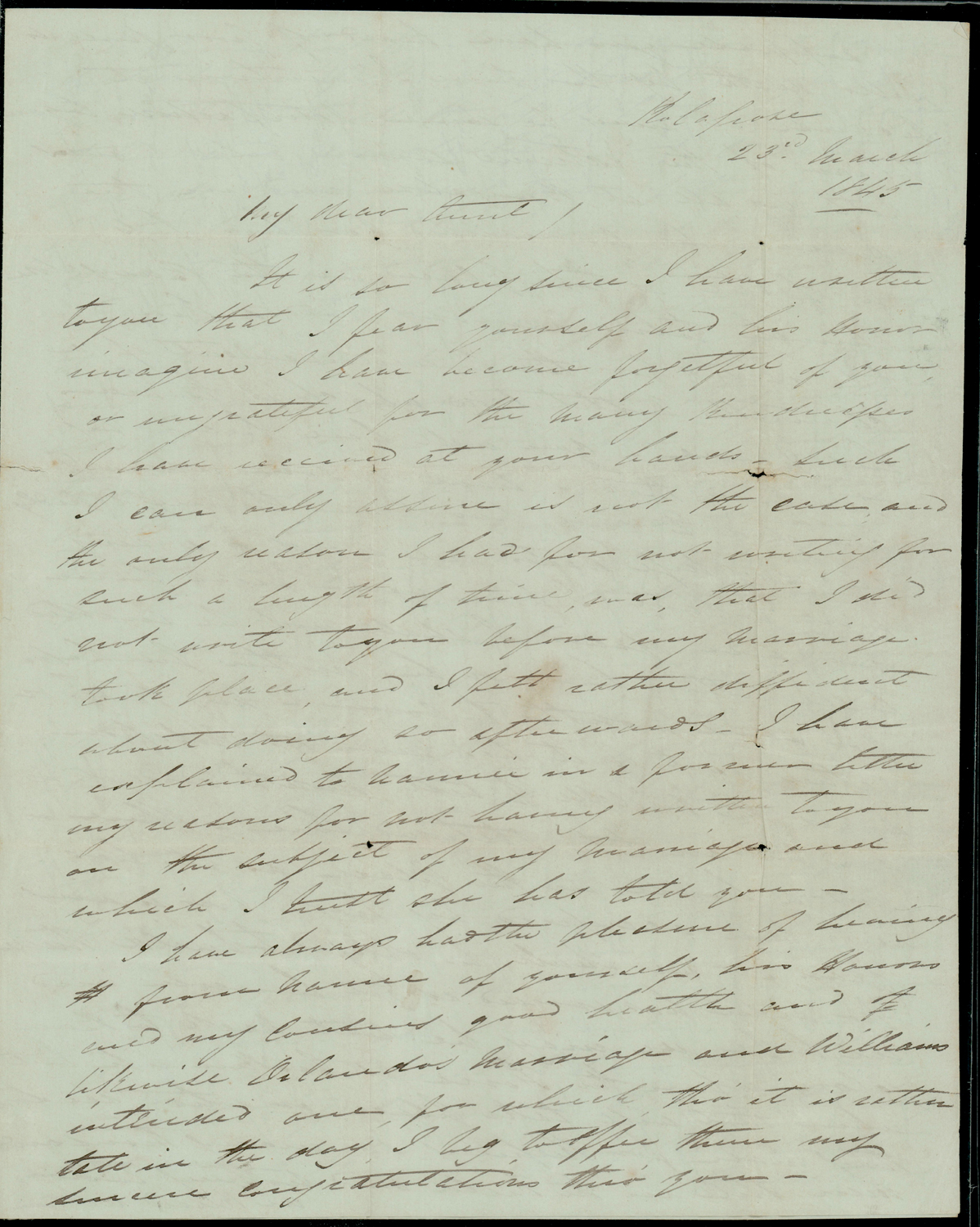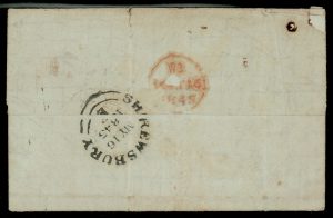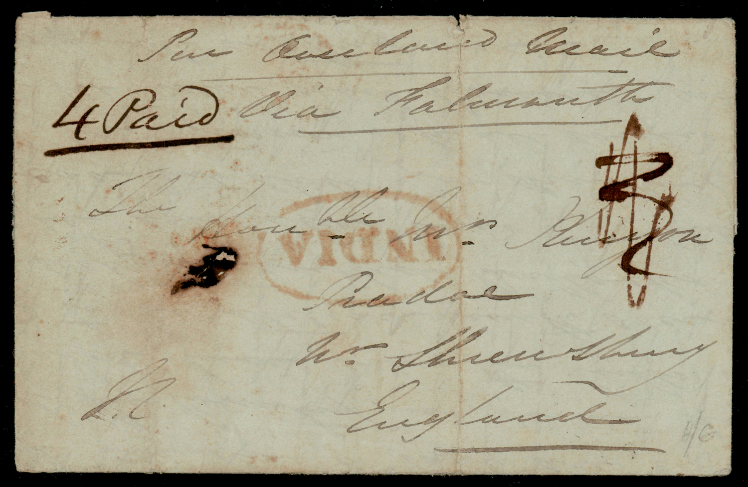 India 1845 INDIA oval in red, Bombay Giles 6, on cover from Kolapore to UK, with “4 Paid” in manuscript