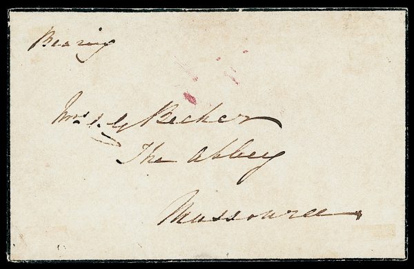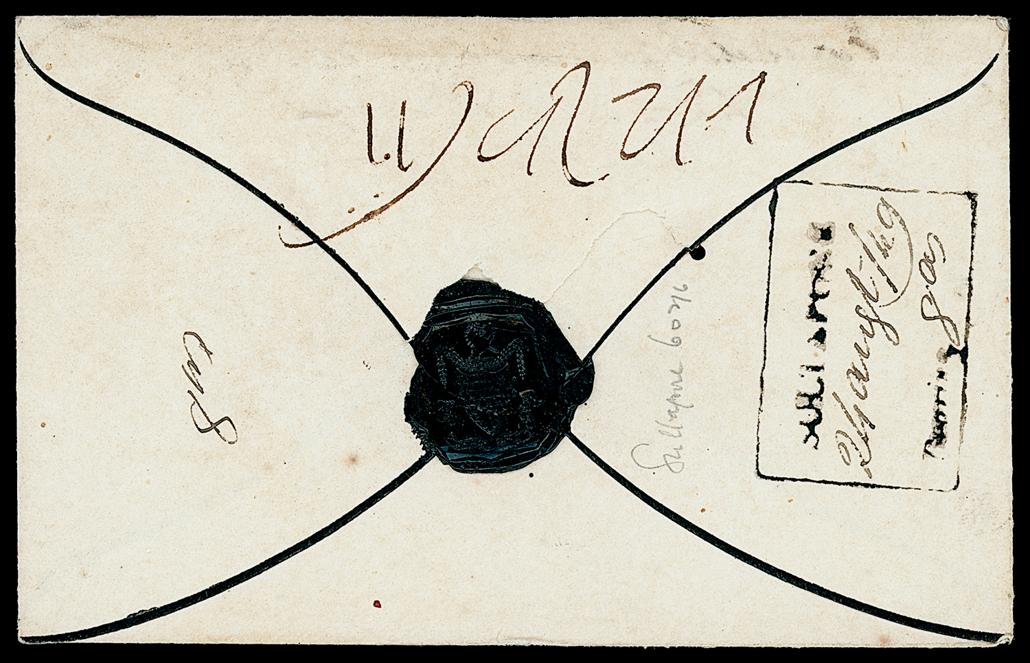India 1849 SULTAPORE/Bearing Giles 1 with manuscript “24 Augt 49” date and “8as” rate markings on back of mourning cover to Mussouree, intact black wax seal of crest, very fine and quite scarce. Giles only records this marking in 1849
