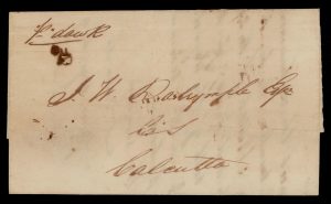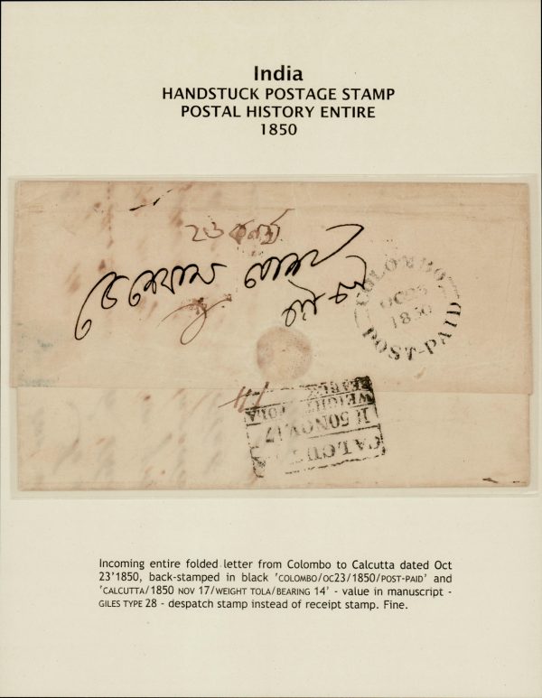 India 1850 CALCUTTA BEARING Giles 28 used as receiving mark on folded letter from Columbo (Oct 23) per “Dawk”, with COLOMBO POST-PAID