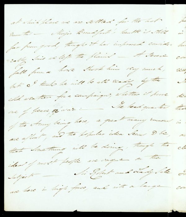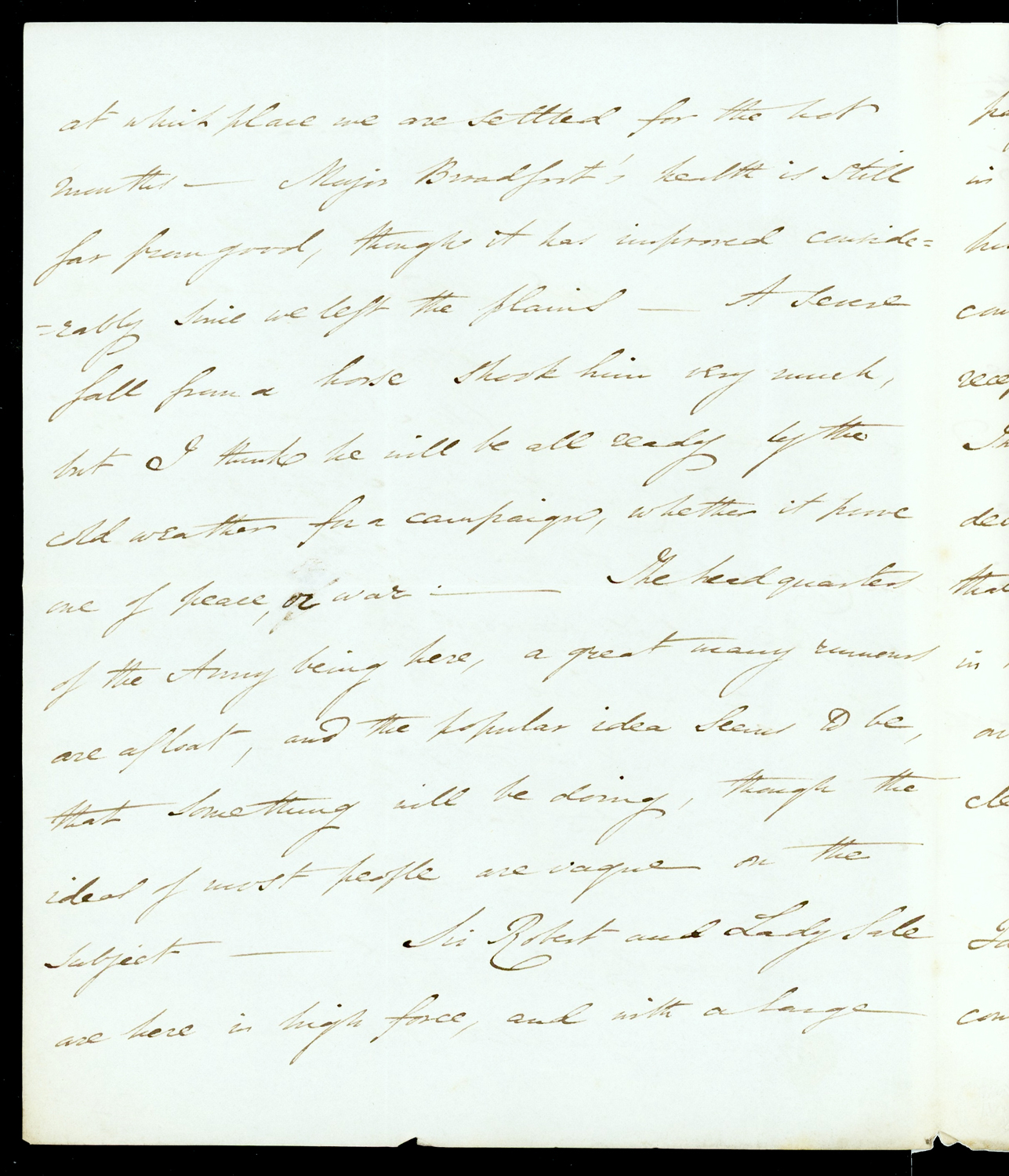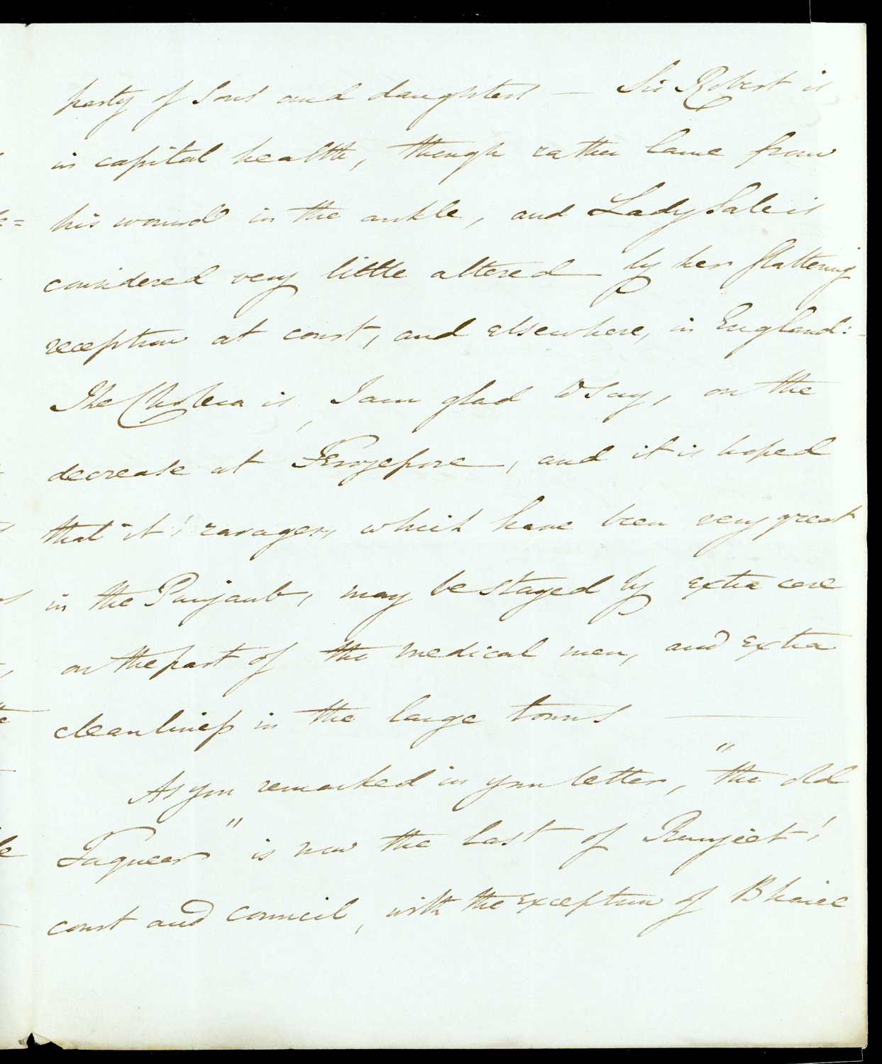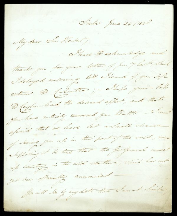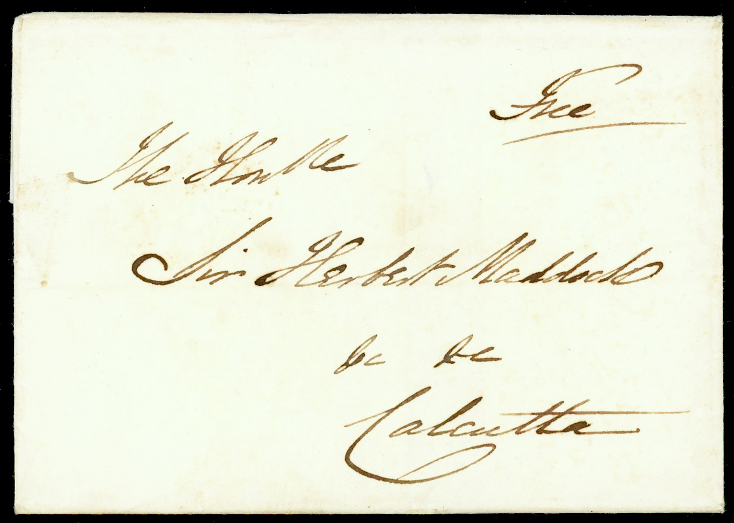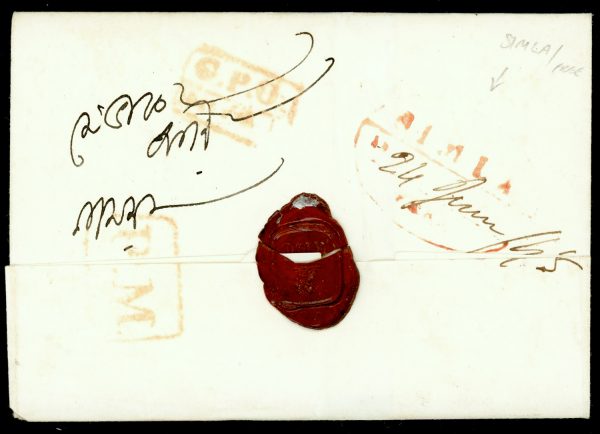 India 1850 (Jun 24) SIMLA FREE Giles 5 (only recorded 1850) on folded letter to Calcutta, with boxed PM and Calcutta G.P.O. arrival. The sender, Robert Crest writes “…that the Governor General comes up country in the cold weather, which has not yet been officially announced. Major Bradford…I think will be ready by the cold weather for a campaign, whether it is one of peace or war.“
