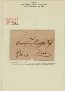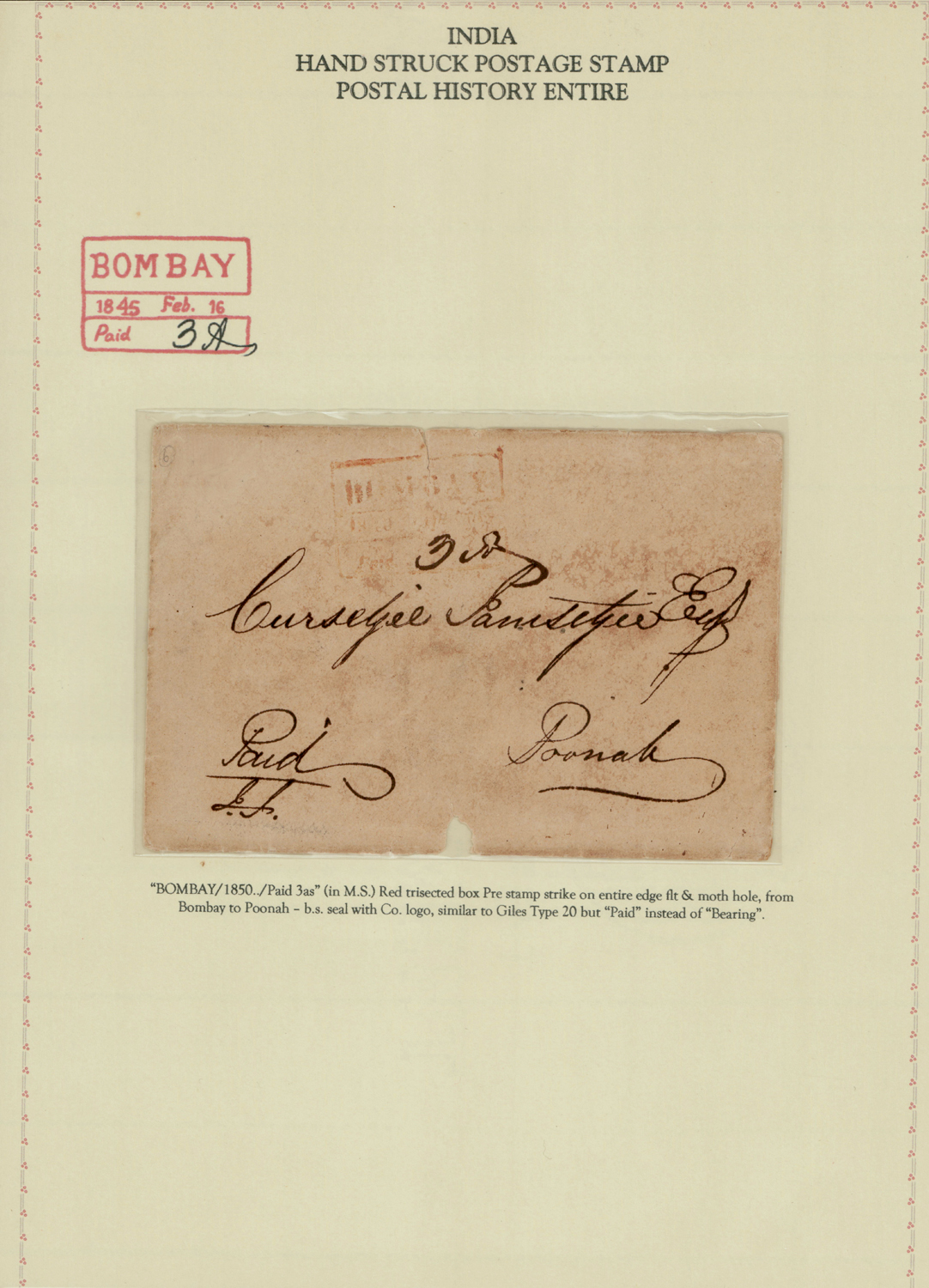 India 1852 BOMBAY Paid in red, as Giles 20 but Paid instead of Bearing, on cover to Poona