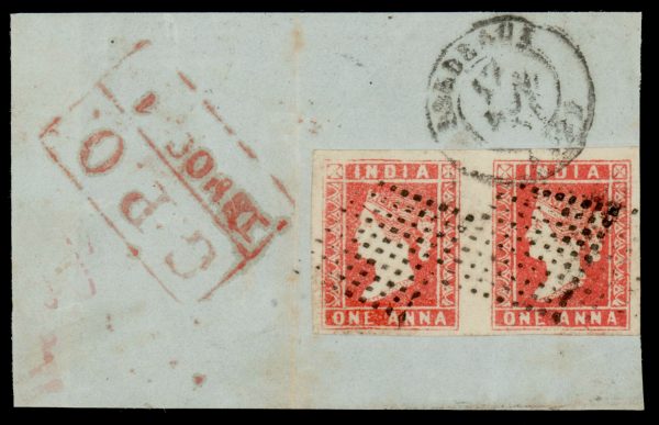 India 1854 1a red, die I, imperf, horizontal pair on piece to France with Bordeaux cds. SG 12