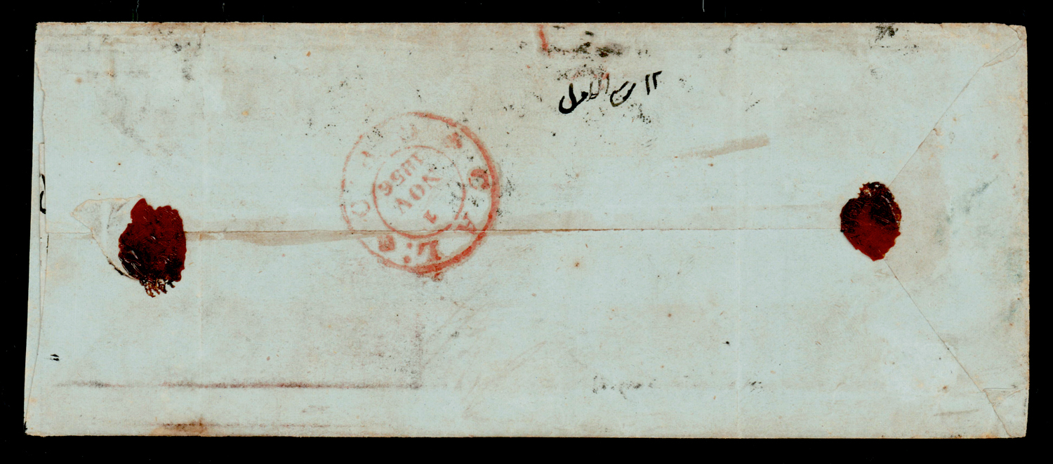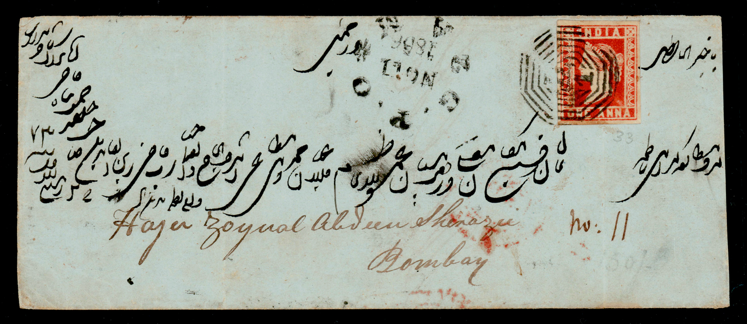 India 1854 1a red, die III, imperf, tied by B/1 on 1856 (Nov 1) folded letter to Bombay