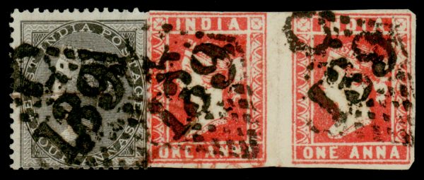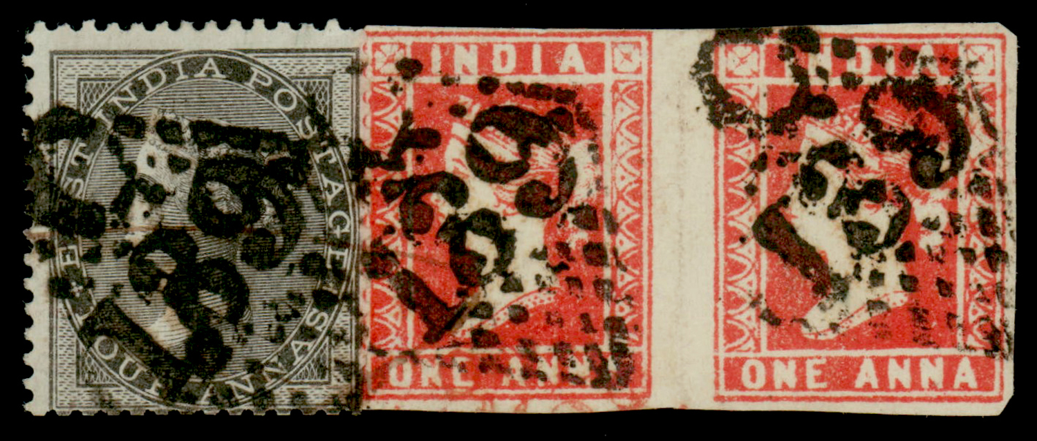India 1854 1a red, imperf pair alongwith EI 4a black on piece, each tied by “C/139” cancels of Madura