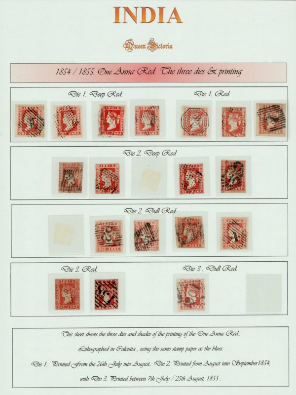 India 1854 1a red, imperf x 18 used examples showing various dies and shades (17). SG 11/16