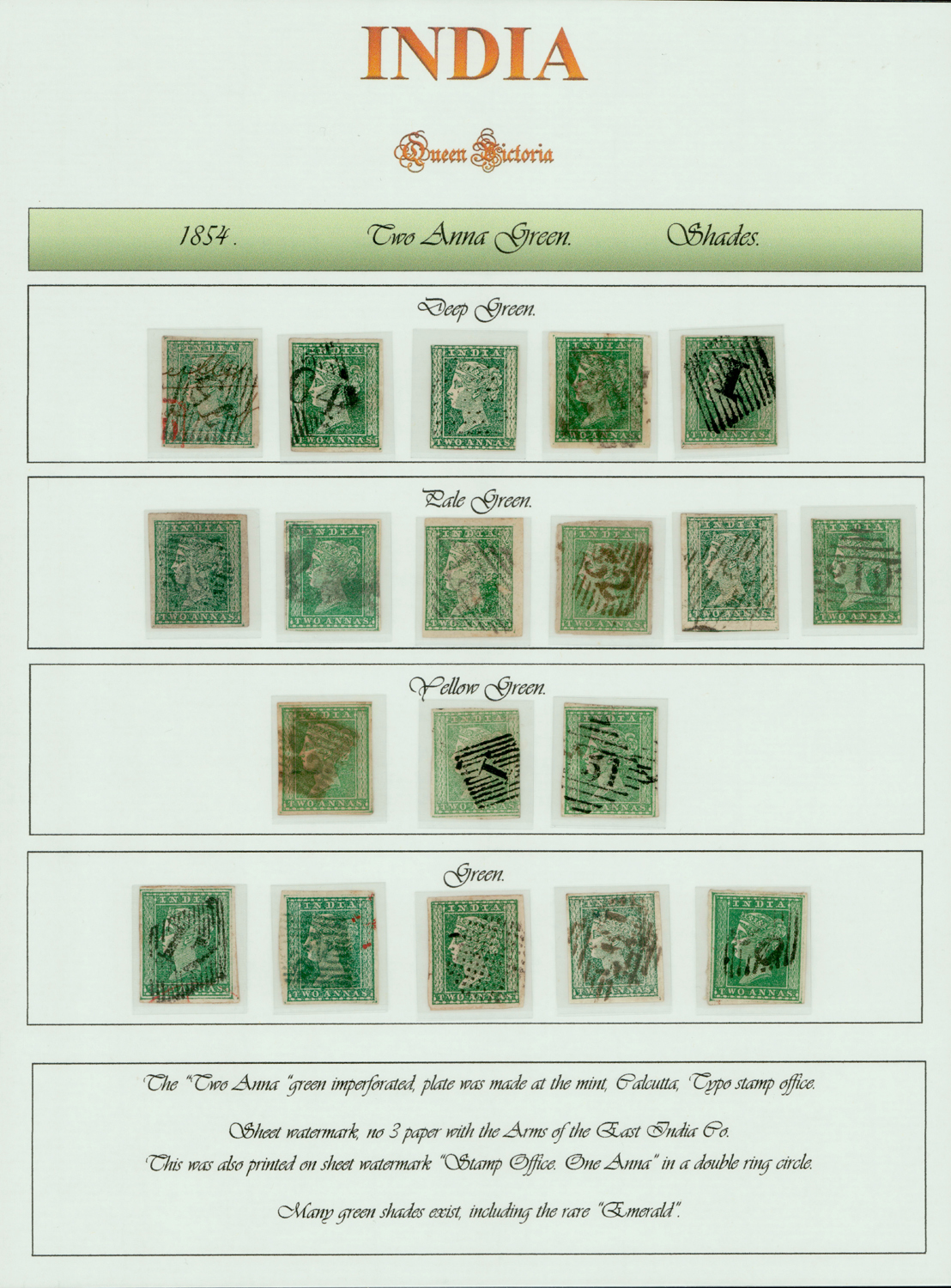 India 1854 2a green, imperf x 19 used examples showing various shades of green, used. SG 31 £1235