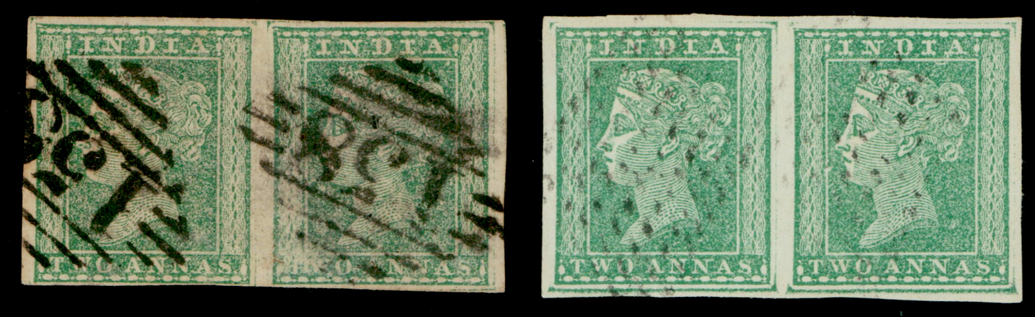 India 1854 2a green, imperf x 2 pairs, used. SG 31 £260+
