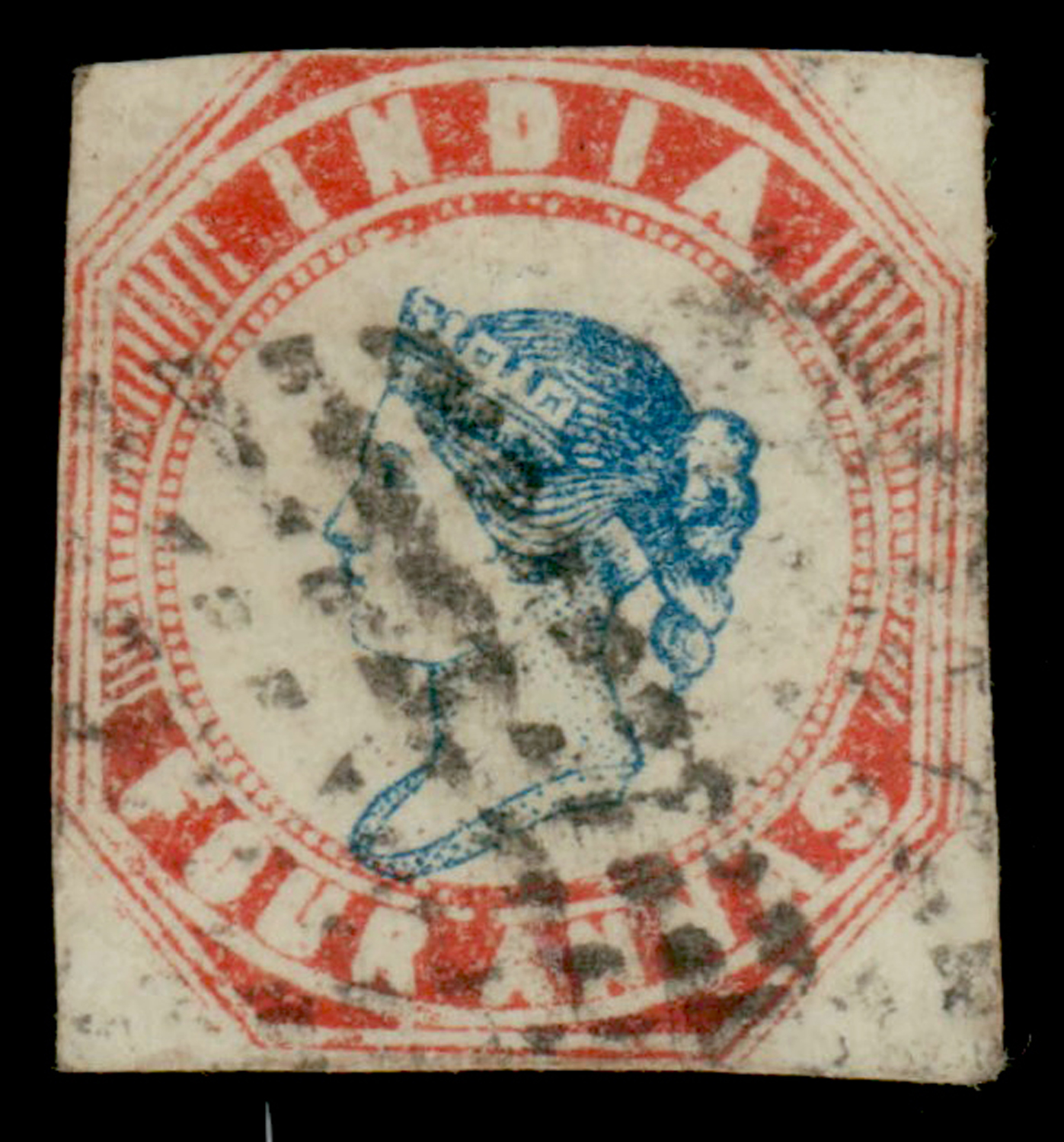 India 1854 4a blue and red, imperf, head II, frame I, second printing, cut square, pos.9, reverse inverted watermark, used. SG 19 £950