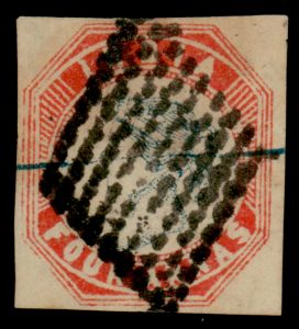 India 1854 4a blue and red, imperf, head III, frame I, third printing, retouched chignon, cut square, pos.11, reverse watermark, used. SG 21 £3,000