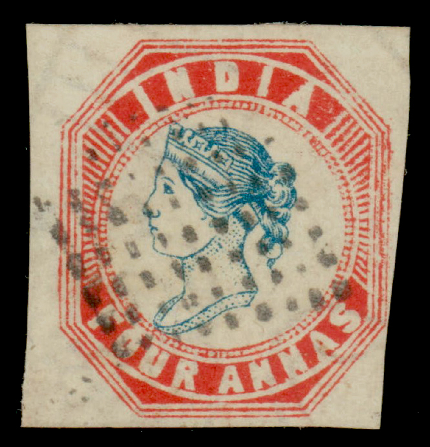 India 1854 4a blue and red, imperf, head III, frame II, fourth printing, cut square, pos.11, used. SG 23 £750