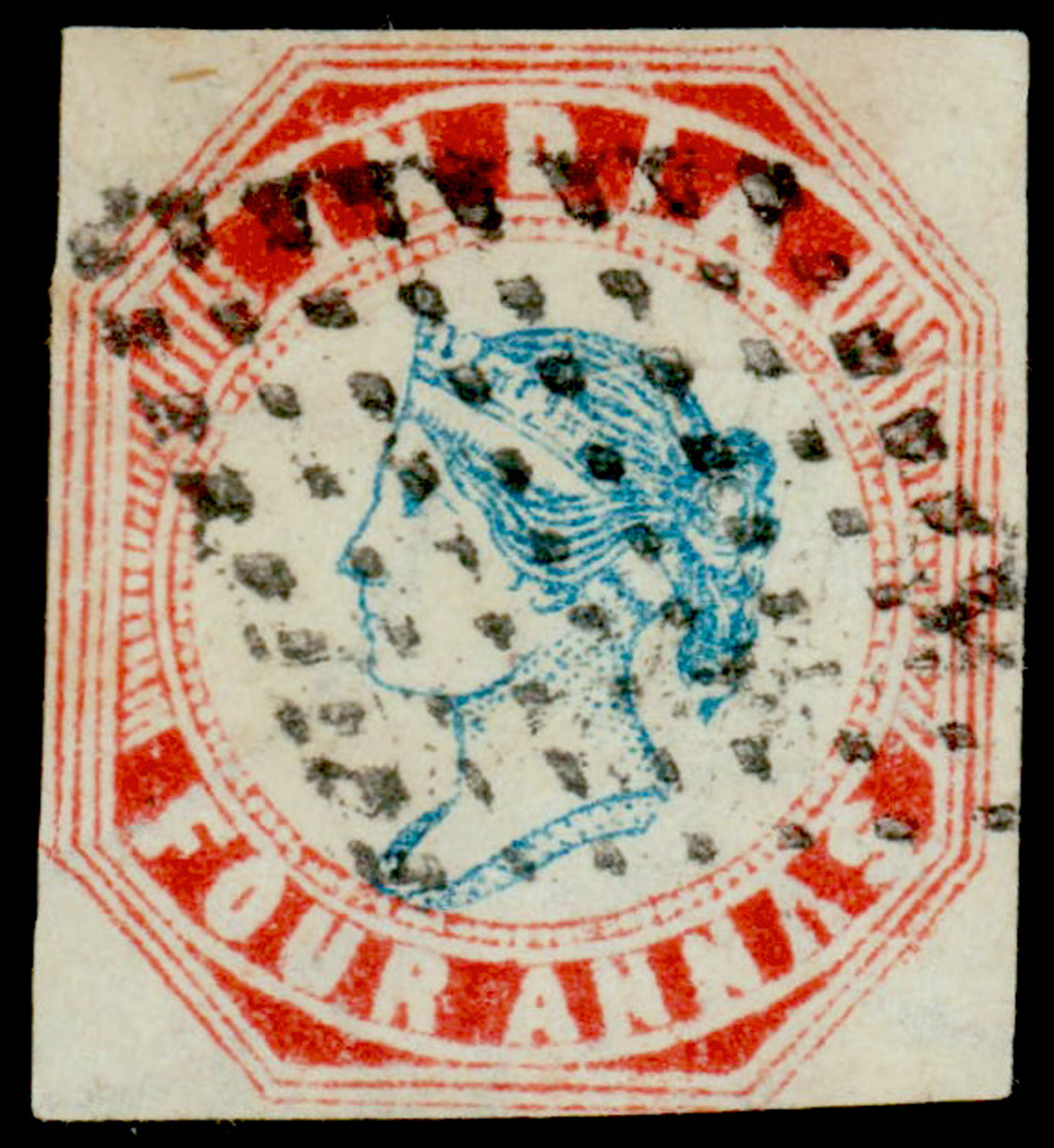 India 1854 4a blue and rose red, imperf, head III, frame II, medium setting, fifth printing, pos.16 reverse watermark, horizontal paper crease, flaw in second “A” of ANNAS, cancelled with diamond of dots. SG 25. £1,400