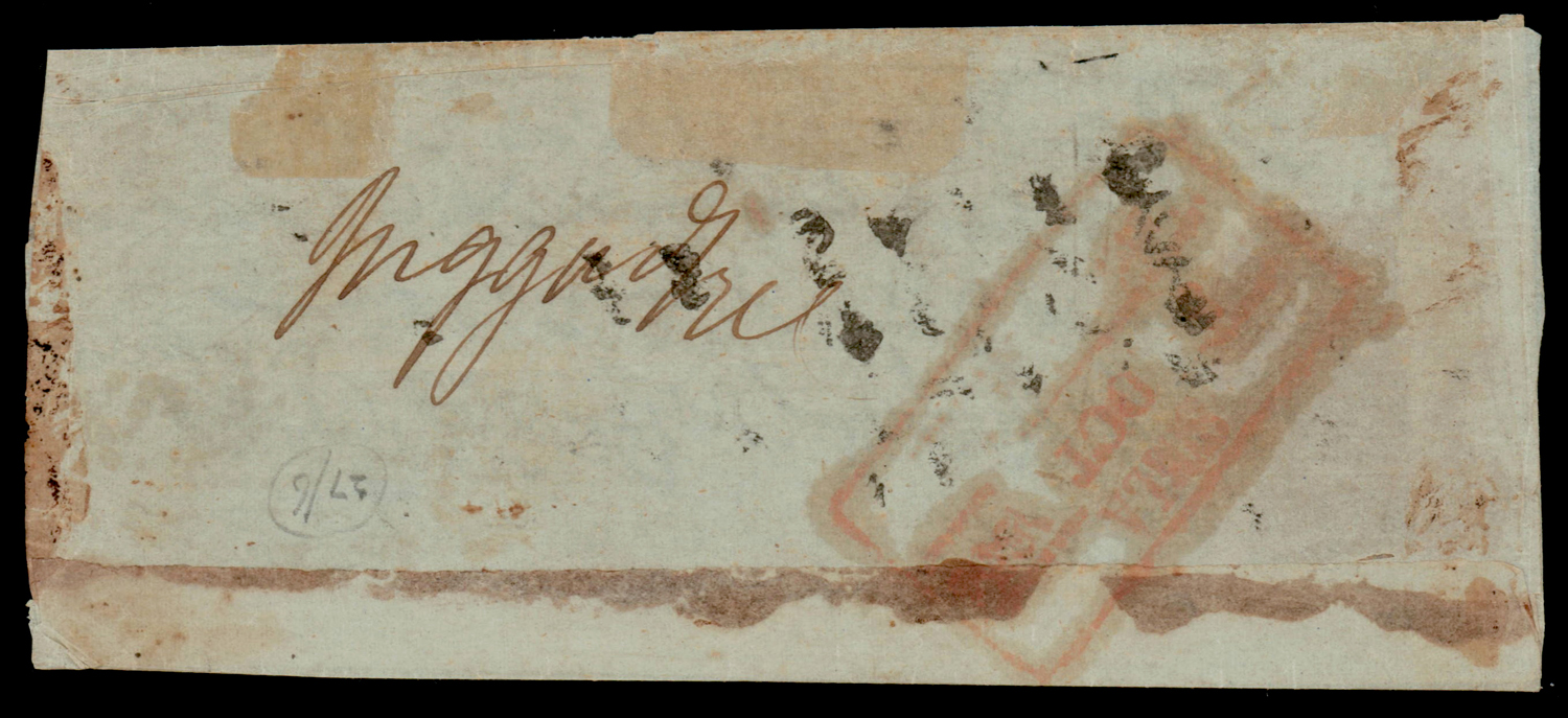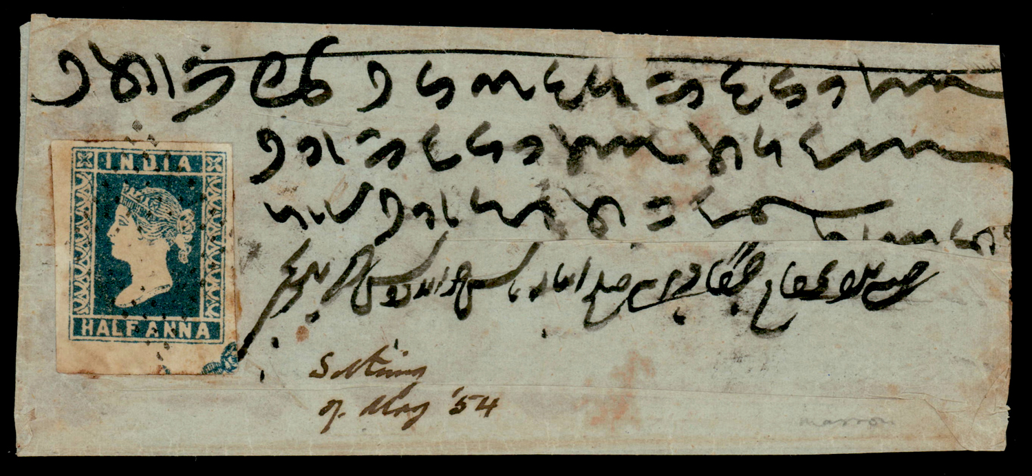 India 1854 ½a indigo, die I, imperf, pos.96, showing corner ornament at bottom right, used on cover from Simla. SG 5