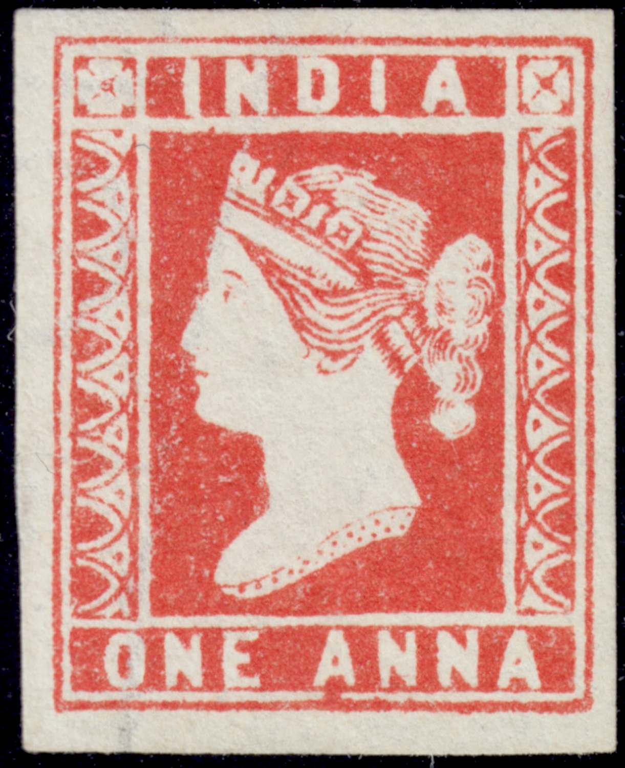 India 1854 QV 1a deep red, die II, imperf, unused without gum as issued. SG 14 £475