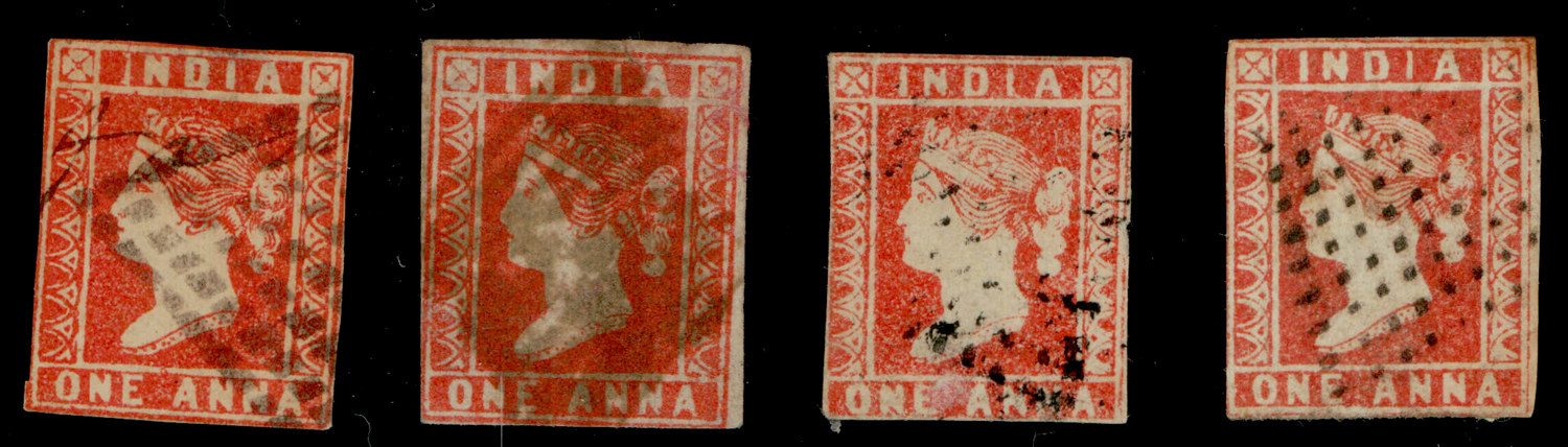 India 1854 QV 1a red, imperf x 4 used examples, unchecked for die.