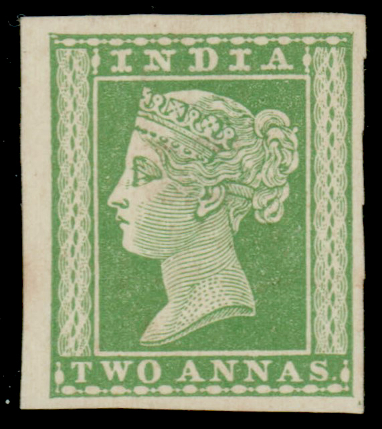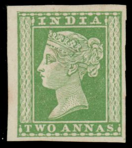 India 1854 QV 2a green essay/reprint on yellowish wove paper