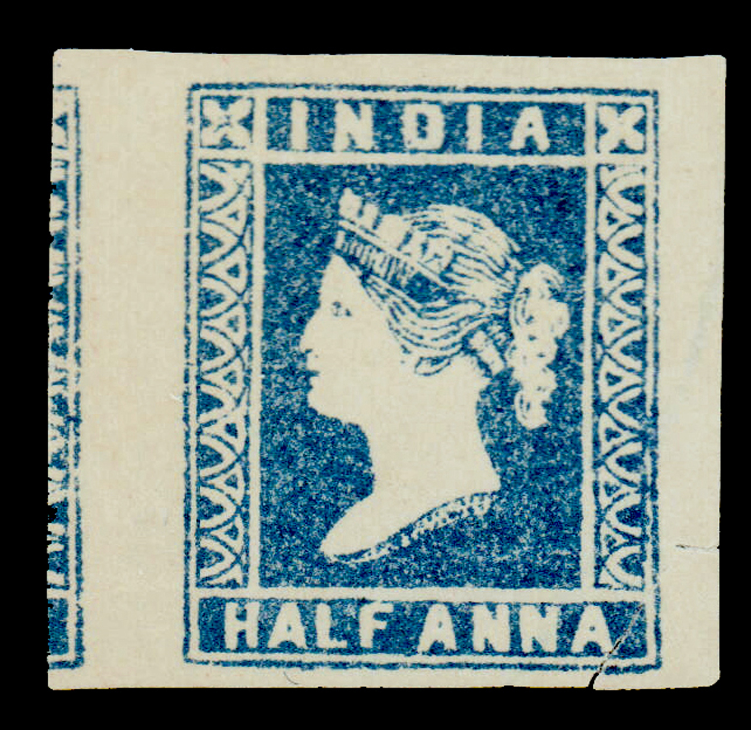 India 1854 QV ½a blue, imperf, die II, with part of adjacent stamp showing on the left, unused without gum as issued. SG 6 £275