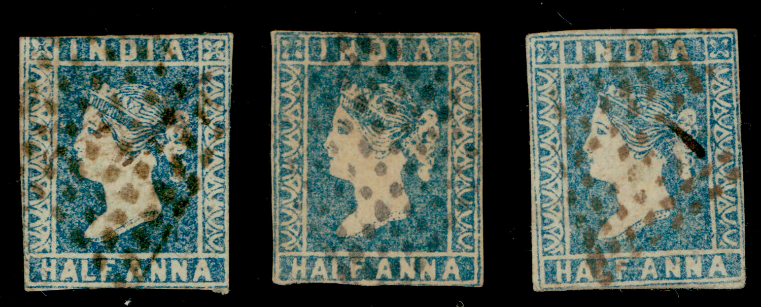 India 1854 QV ½a blue, imperf x 3 used examples, unchecked for die.