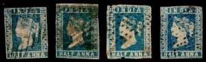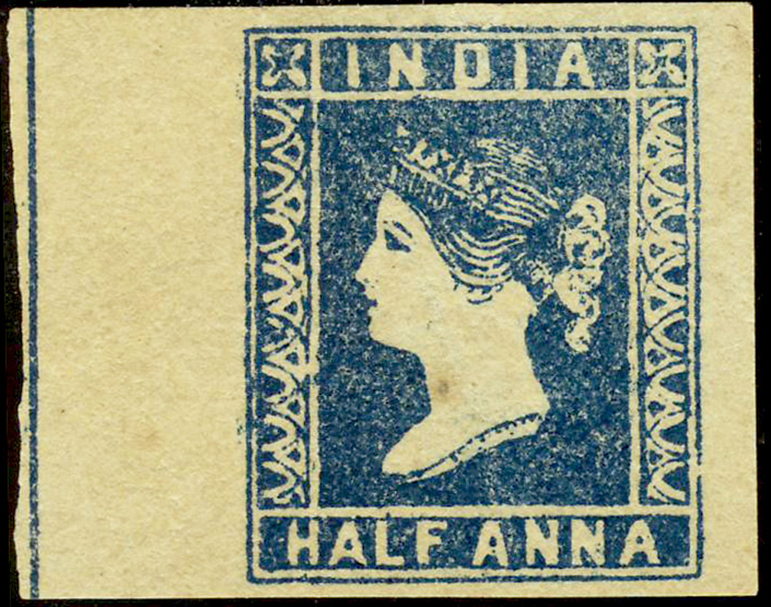 India 1854 QV ½a deep blue, imperf, die I, left marginal example, unused without gum as issued, fine. SG 4 £250+