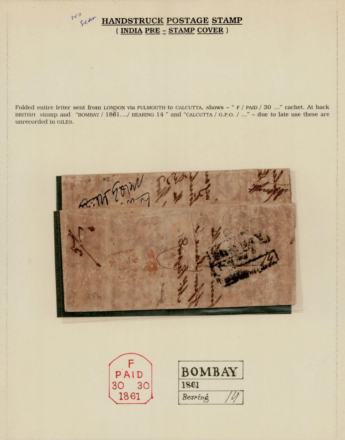 India 1861 BOMBAY Bearing in black, Giles 20 on incoming folded letter from UK to Calcutta