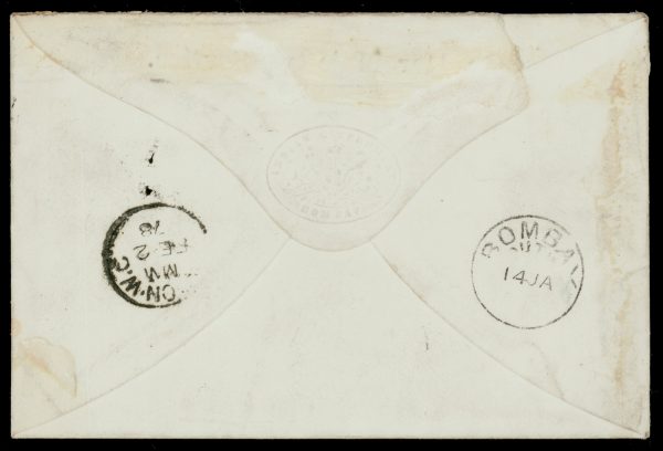 India 1865 QV 2a orange, strip/3, variety: perforations heavily shifted vertically, showing a good portion of the stamps below, on Official cover to London, tied by very fine Bombay/1 duplex, with dispatch and delivery cds on reverse. SG 62