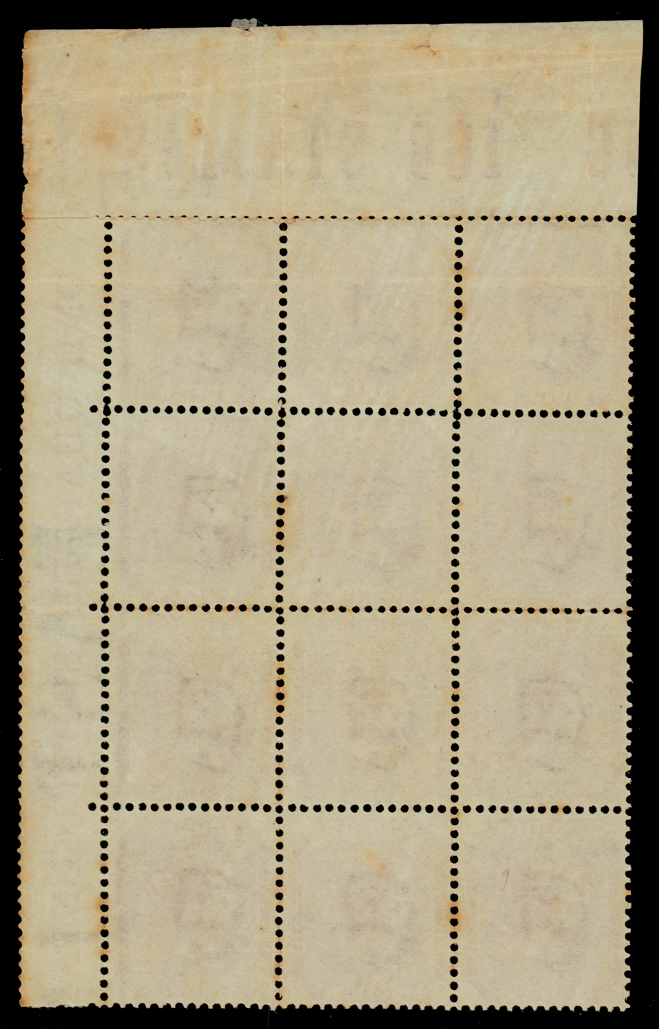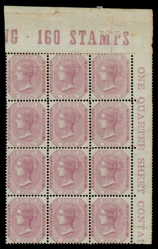 India 1865 QV 8p, watermark elephant’s head, top right marginal blk/12, with sheet inscriptions on top and right, minor tone spots, MNH. SG 57 £360