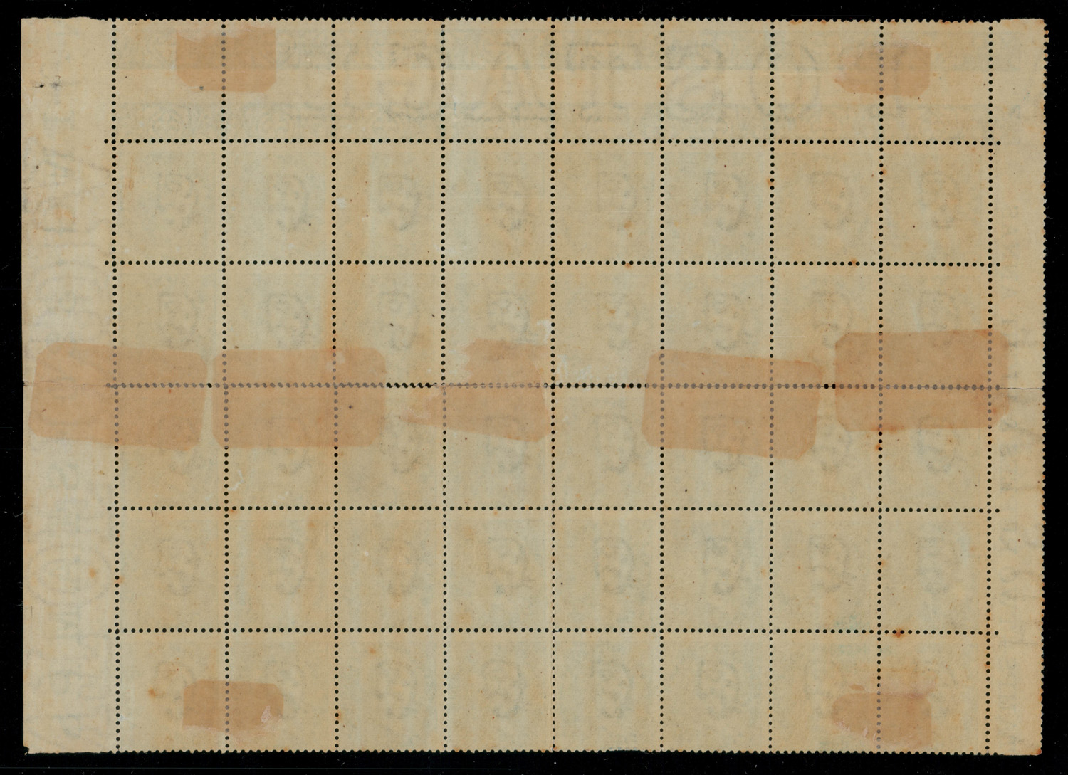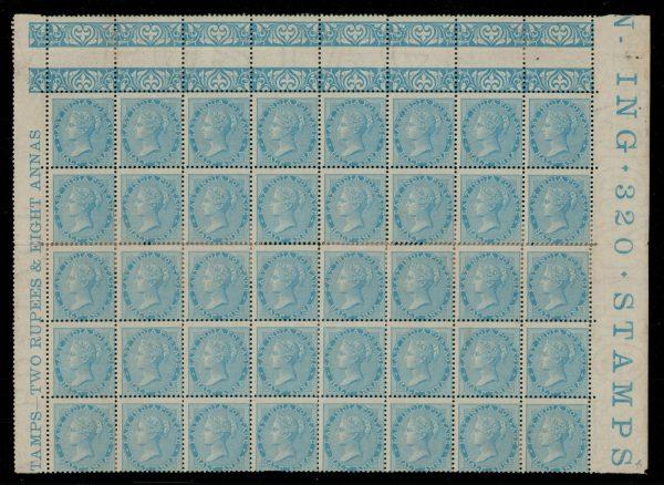 India 1865 QV ½a pale blue, die I, wmk elephant’s head, pane/40 with sheet margins on two sides and gutter on top, mint with hinge re-inforcements on back. SG 55 £1800