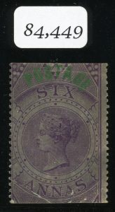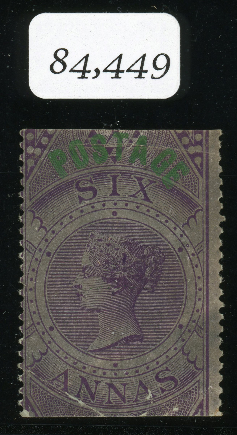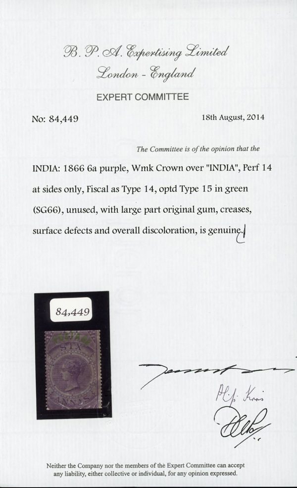 India 1866 6a fiscal stamp ovpt POSTAGE type 16 in green, unused with large part original gum, creases, surface defects which is normal to this issue. SG 68 £5000 – 2014 BPA certificate
