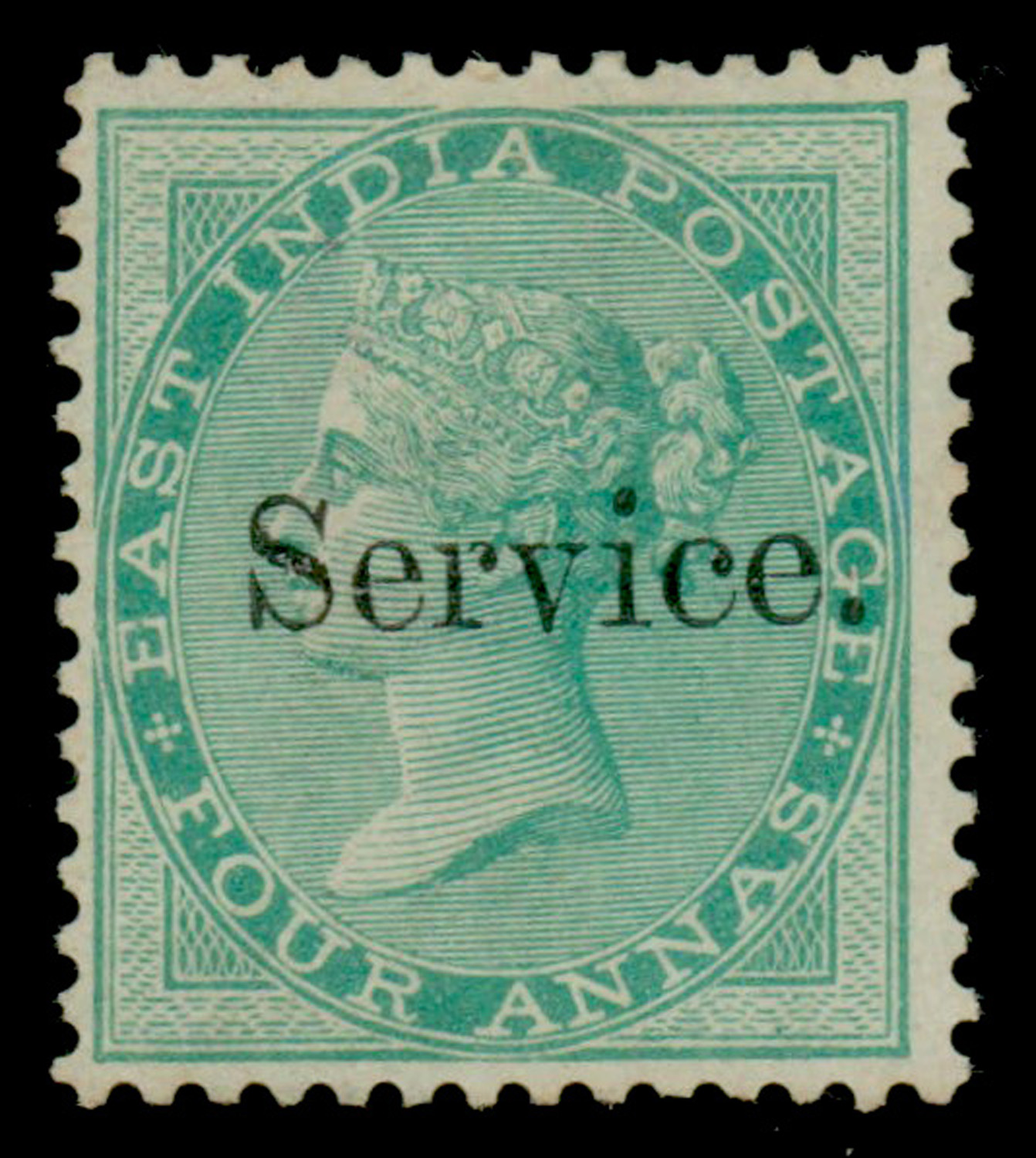 India 1866-72 QV 4a green, ovpt. Small Service on elephant’s head watermarked paper, unused. SG O13 £600