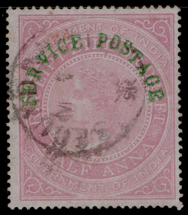 India 1866-72 QV ½a fiscal ovpt. SERVICE POSTAGE, used. SG O19 £180