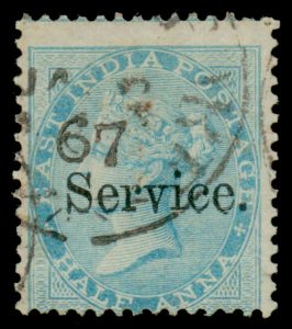 India 1866-72 QV ½a pale blue, ovpt. Small Service on unwatermarked paper, two tiny pinholes, barely visible from front, fine used. SG O2 £300