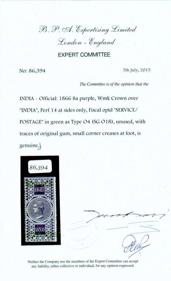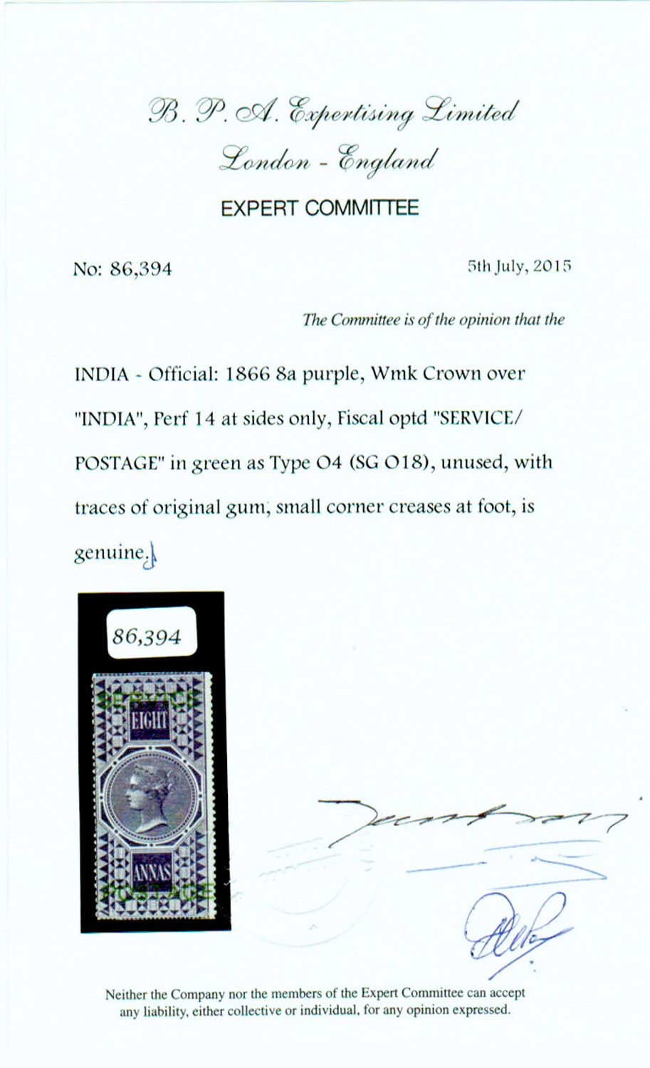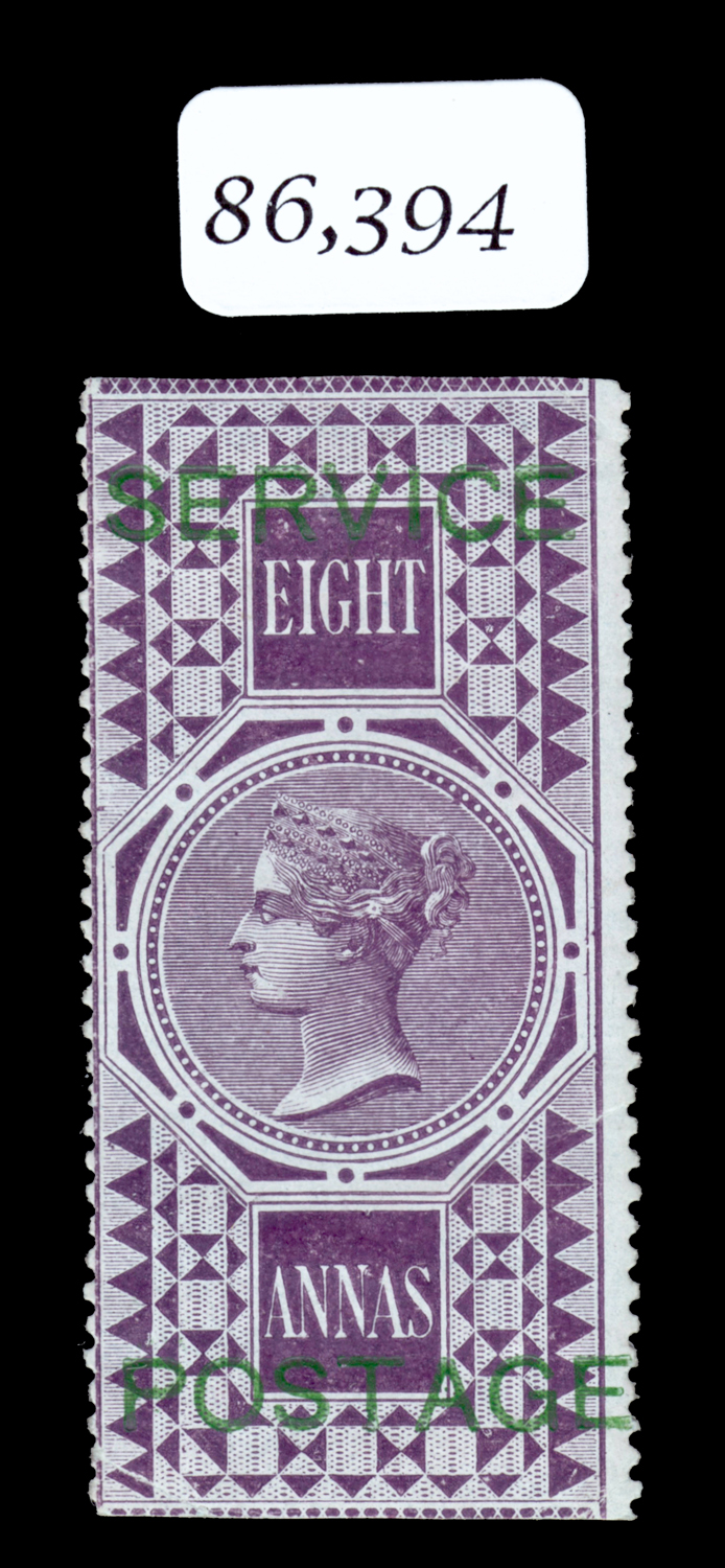 India 1866 8a purple Foreign bill ovpt SERVICE/POSTAGE in green as type O4, mint, extremely fresh and fine, entirely free from the usual surface abrasions and cracks which plague these issues, complete perforations. SG O18 £12,000 – 2015 BPA certificate